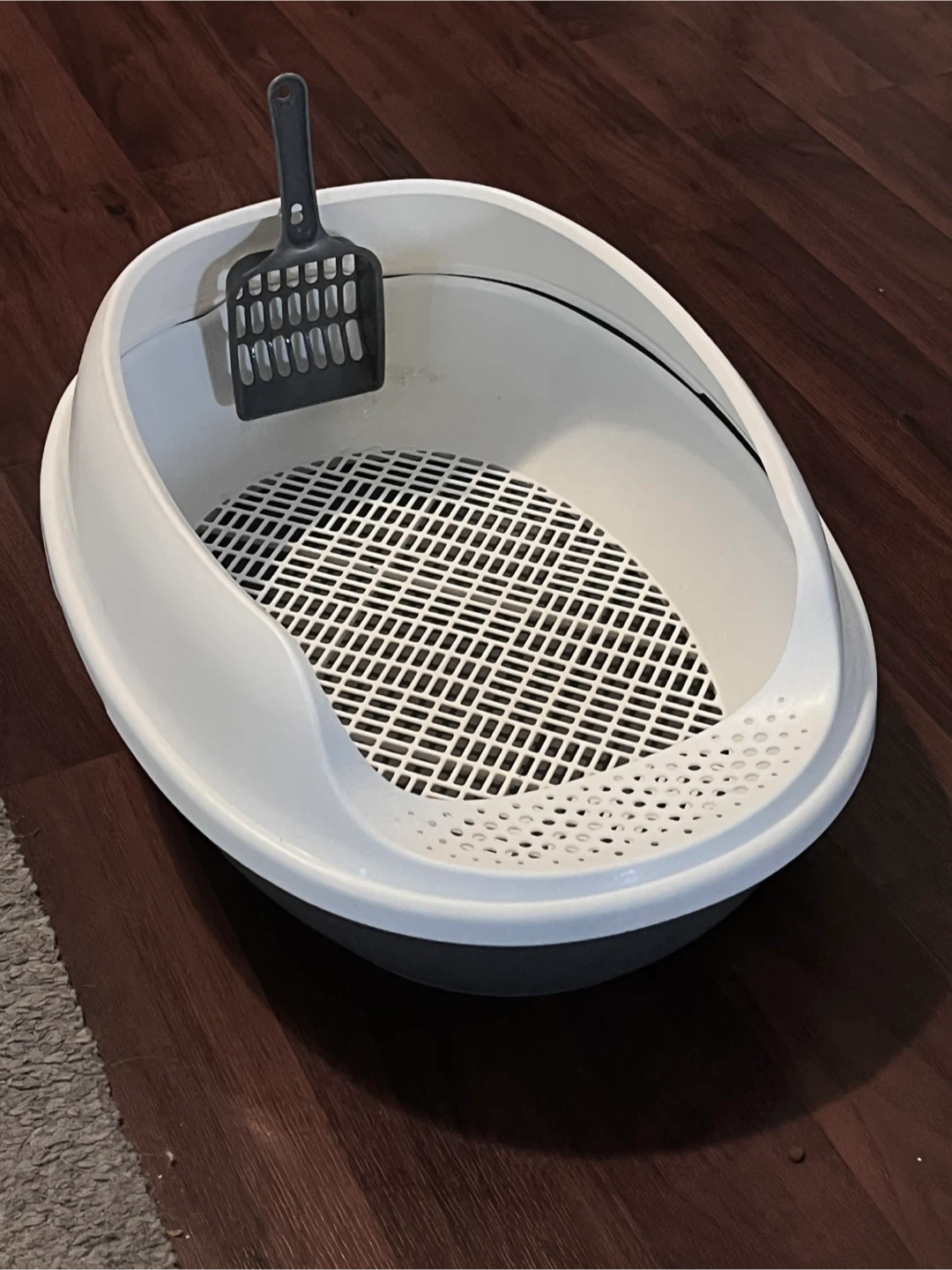 This is a two-piece cat litter box with a removable grate. It includes a matching scoop. Easy to clean and maintain your cat's litter area.