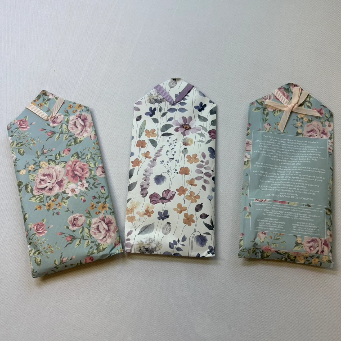 Set of three beautifully floral scented sachets by GC Fragrance featuring elegant floral designs and hanging ribbons. Perfect for freshening up closets, drawers, suitcases, or even your vehicle.