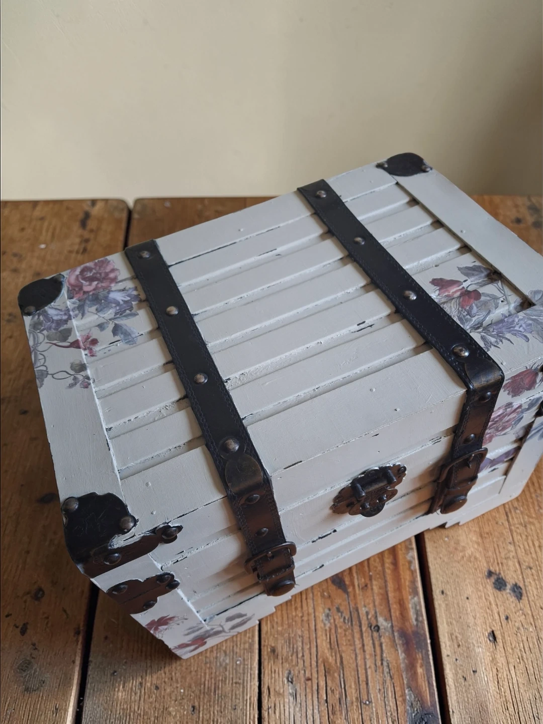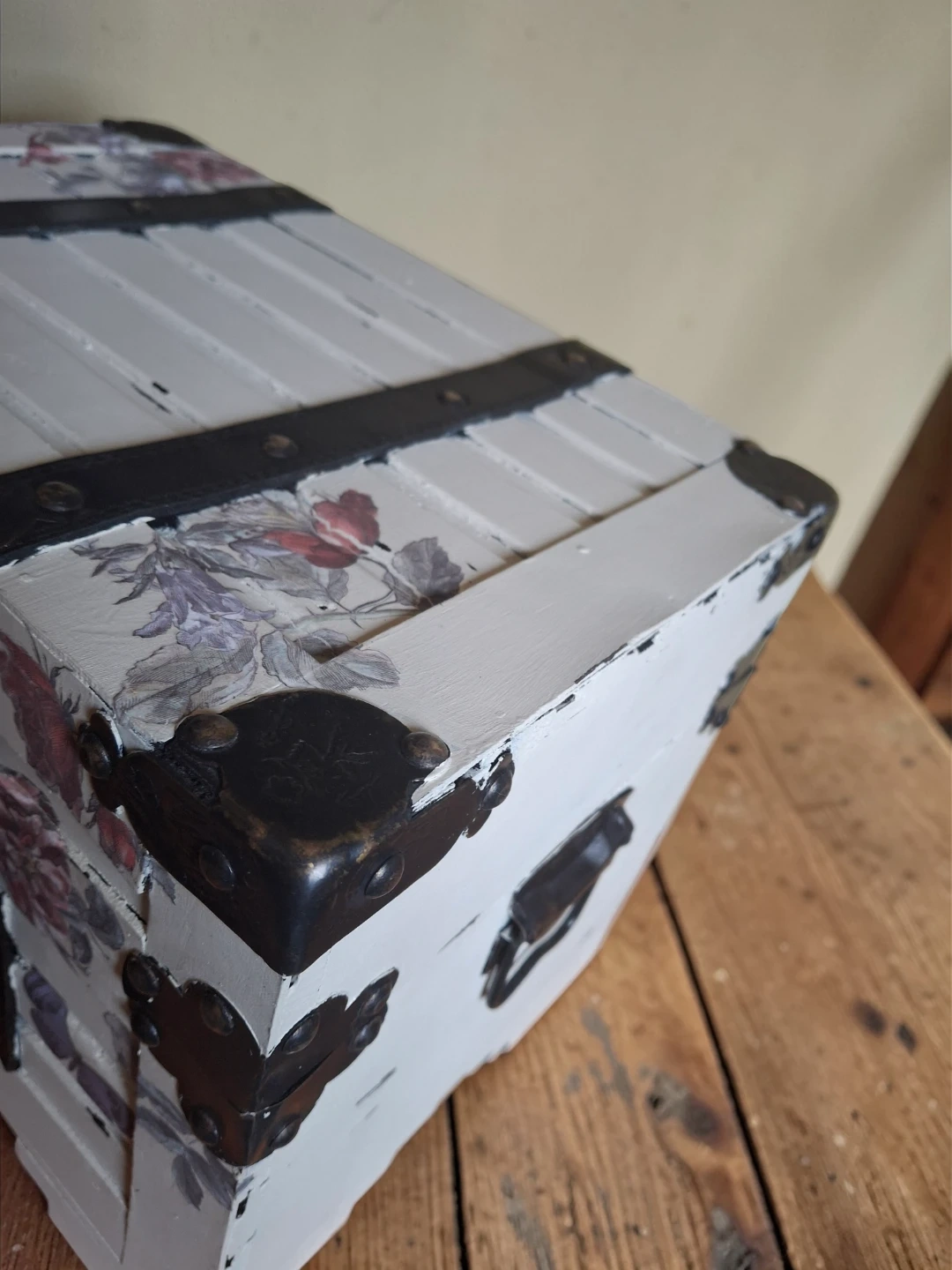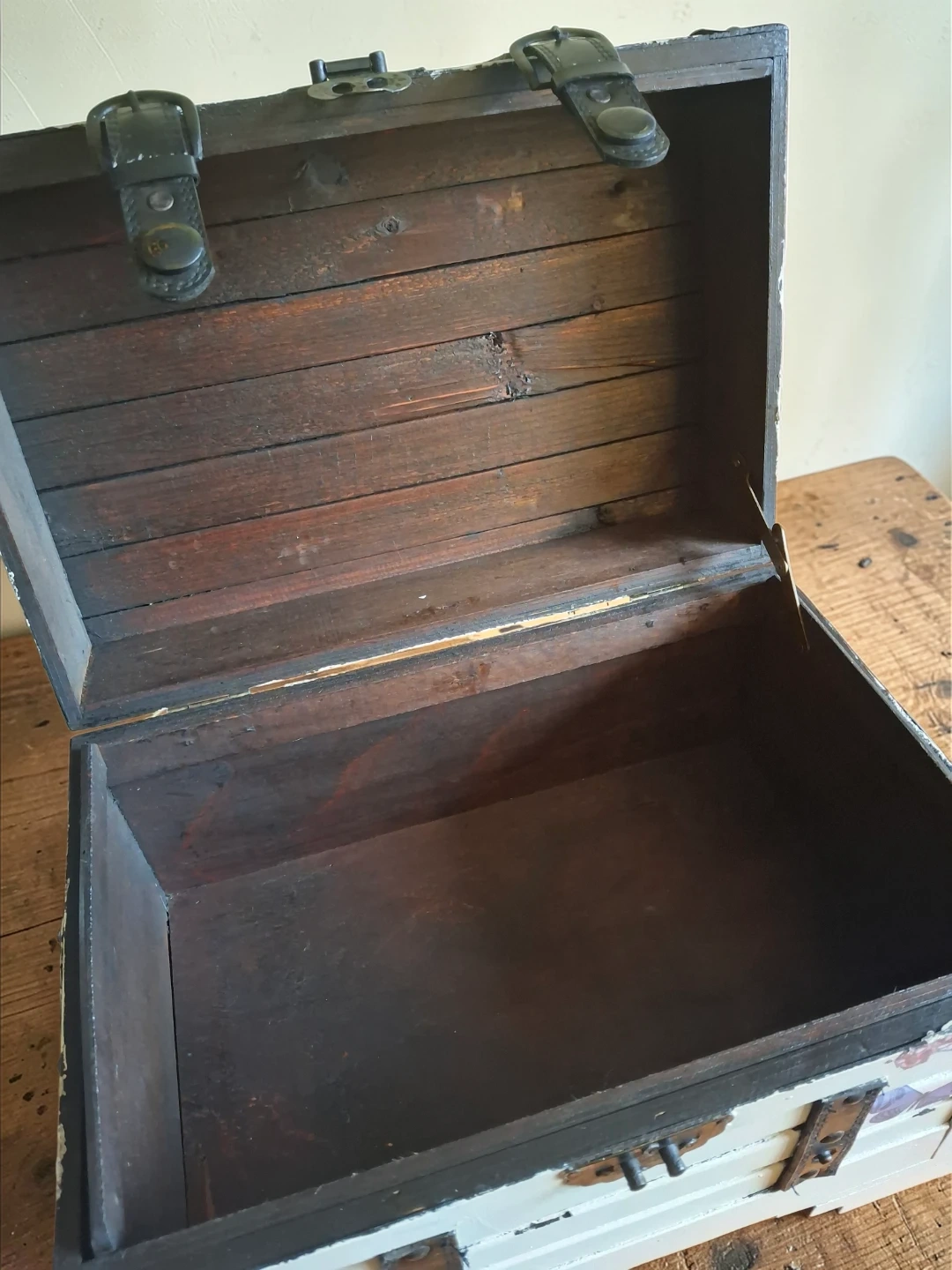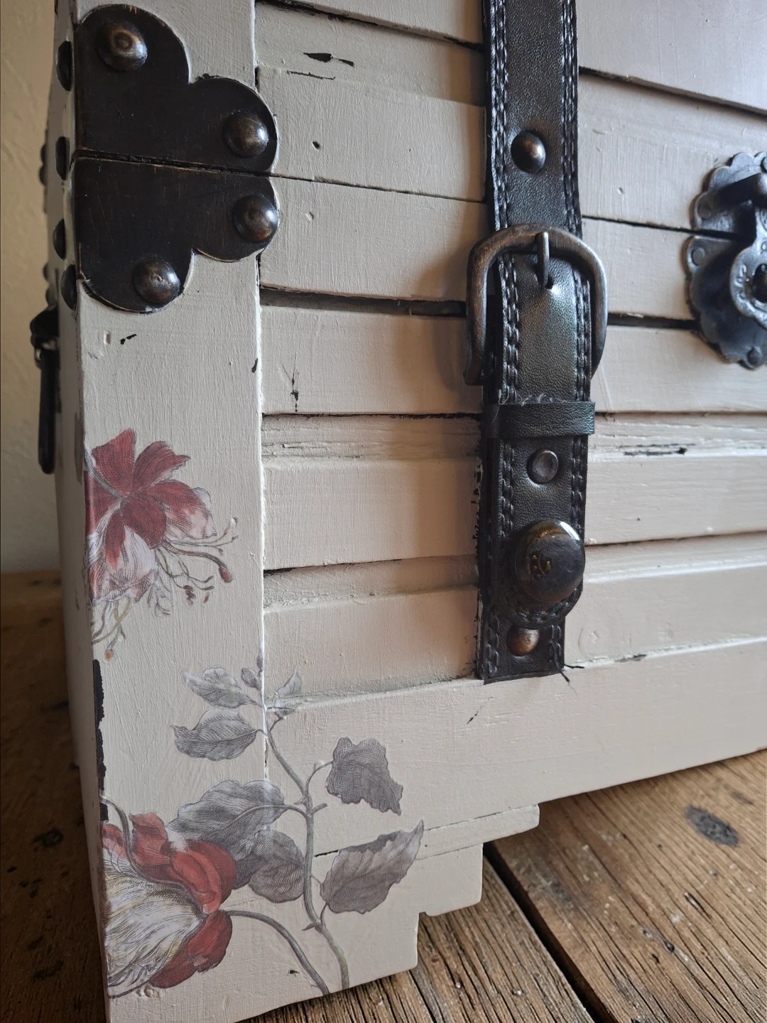 This decorative trunk is perfect for storing keepsakes or small items. It features a distressed white finish with beautiful floral and butterfly paint inlays. The faux leather straps and metal hardware add a vintage touch. A charming accent piece for any room! 14Wx10Hx9.5D. Pickup near Lakeview Park in Oshawa.