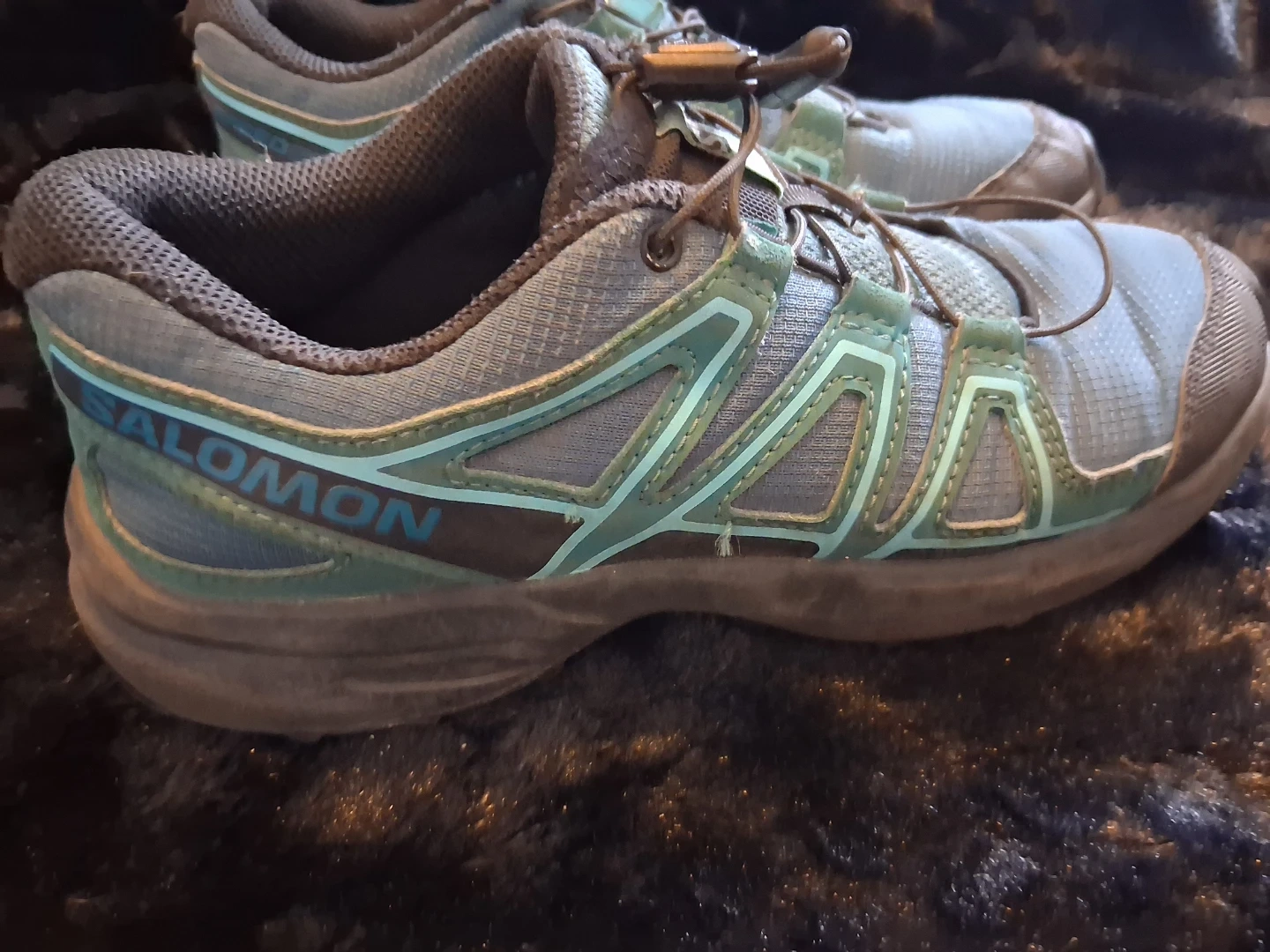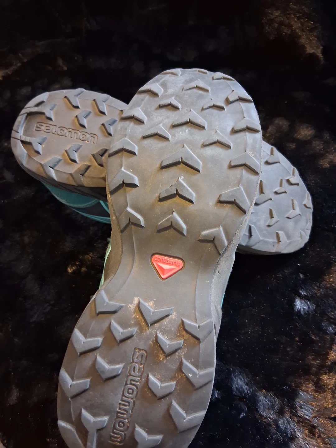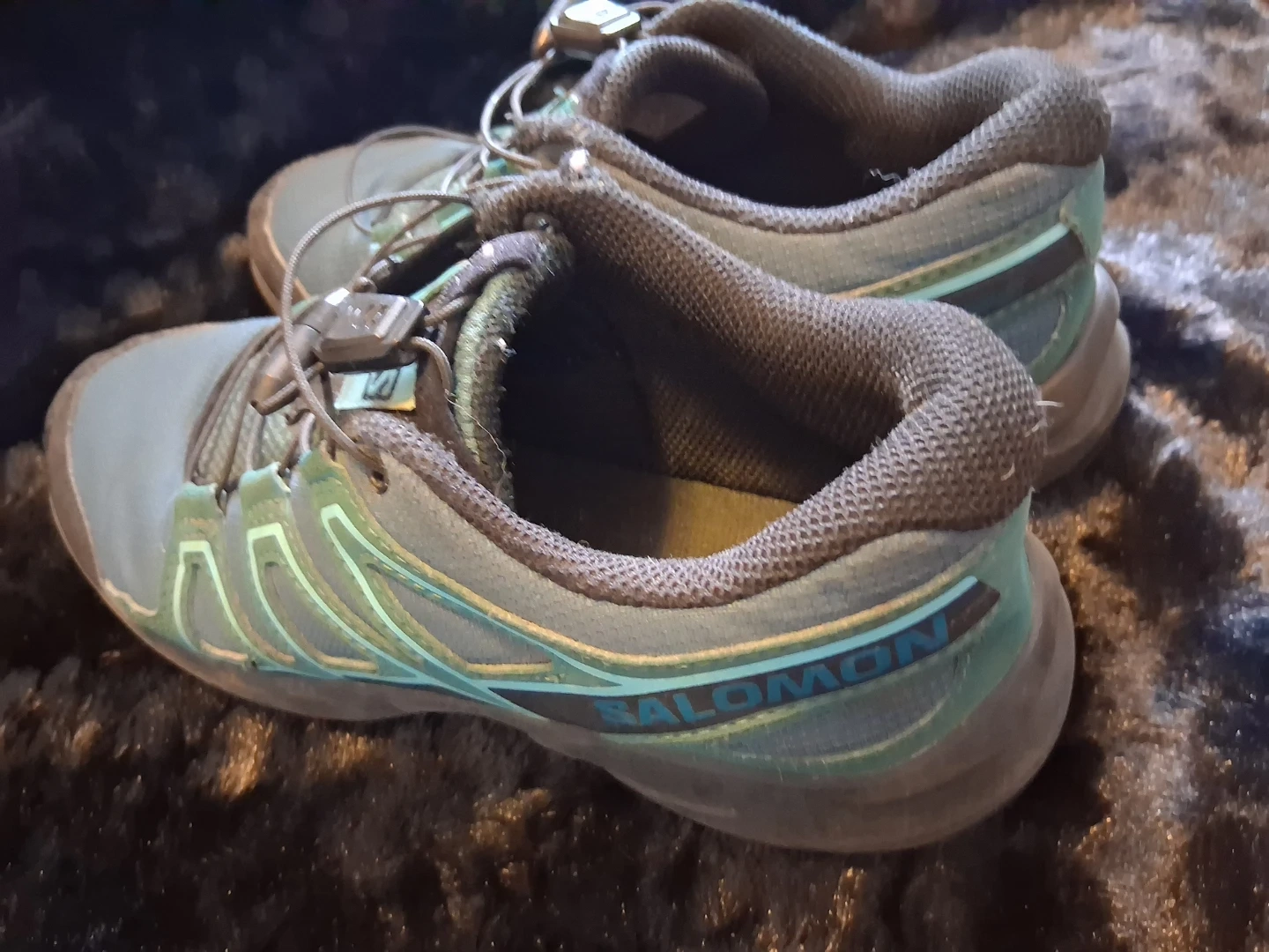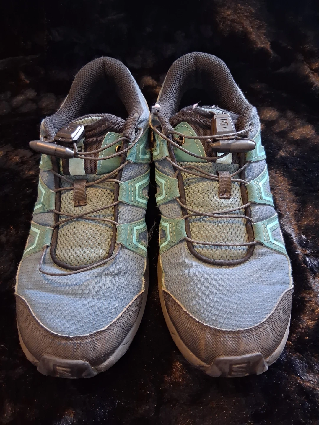 Salomon trail running shoes. Quicklace system for easy on and off. Durable rubber outsole for traction. These shoes are designed for performance on uneven terrain.