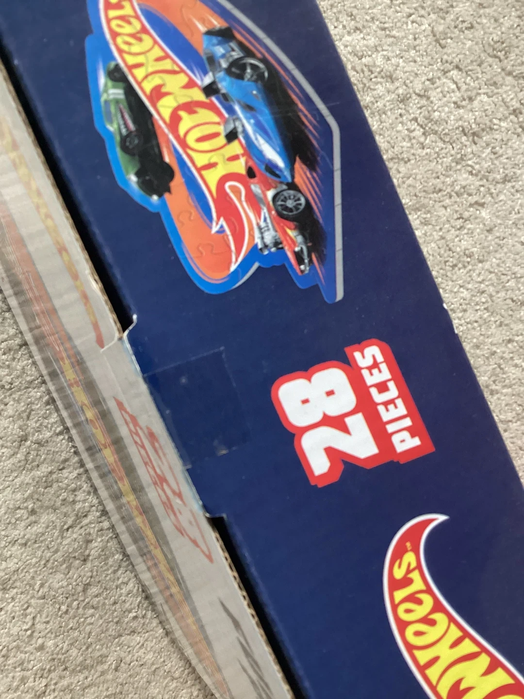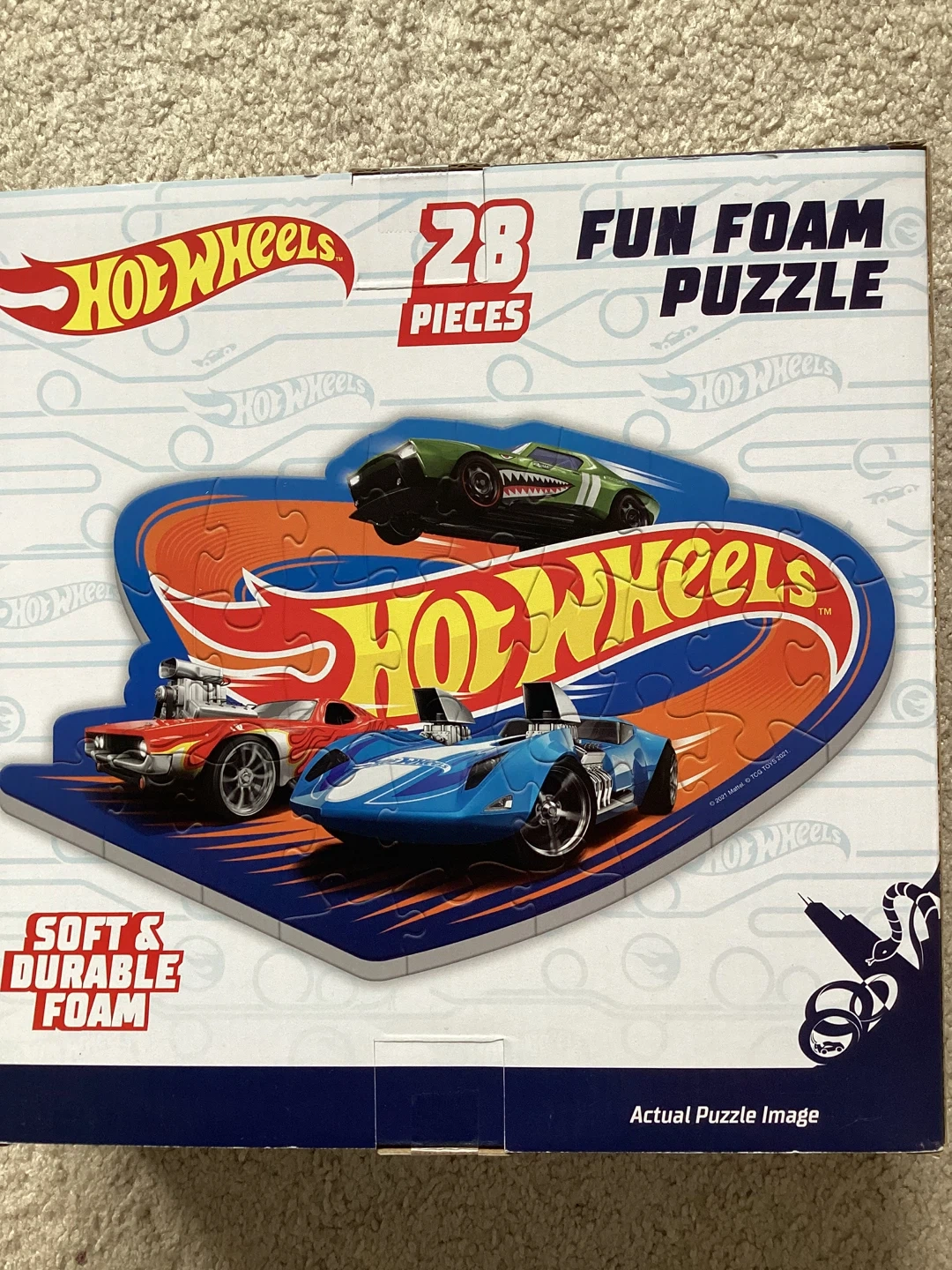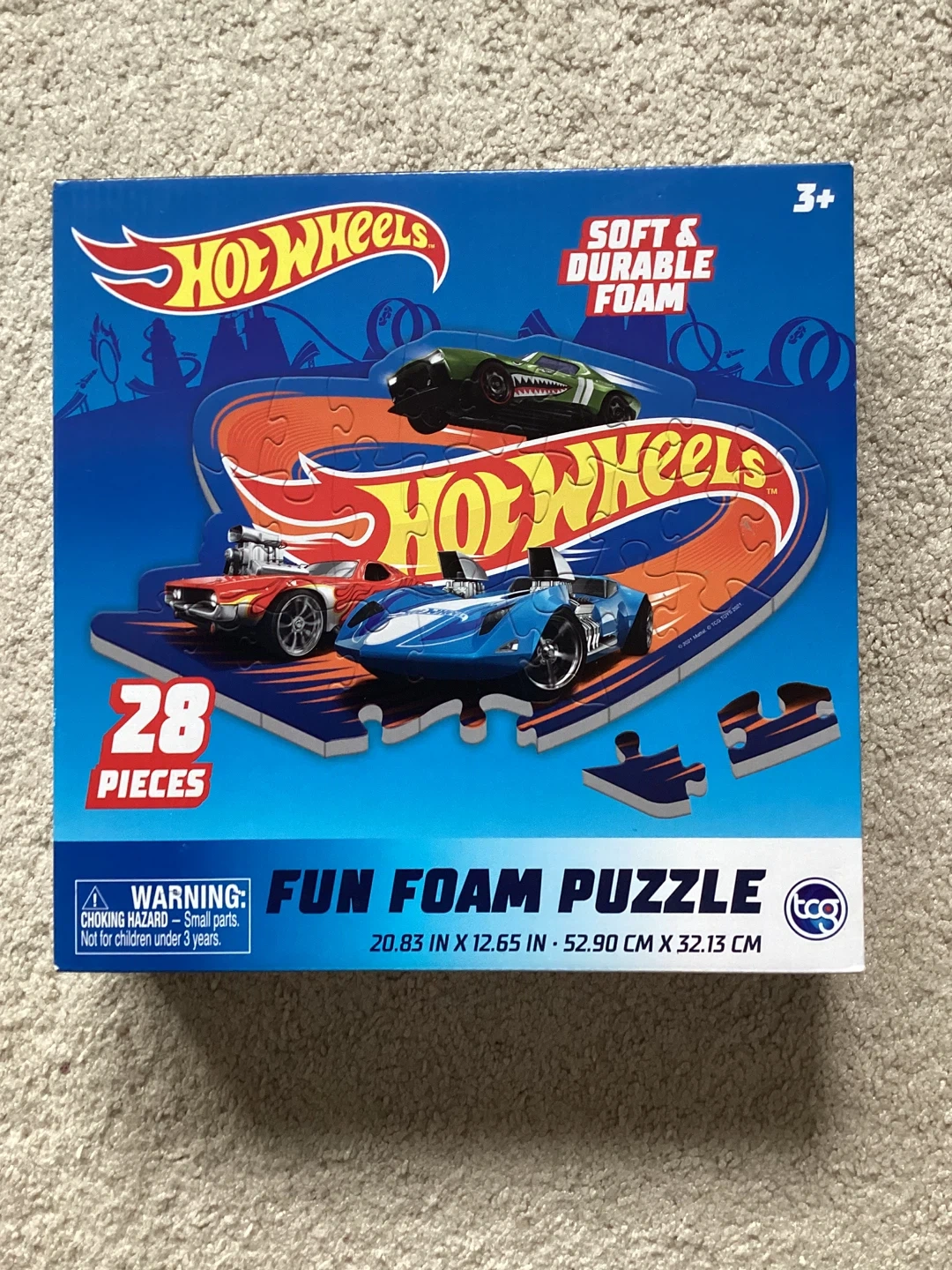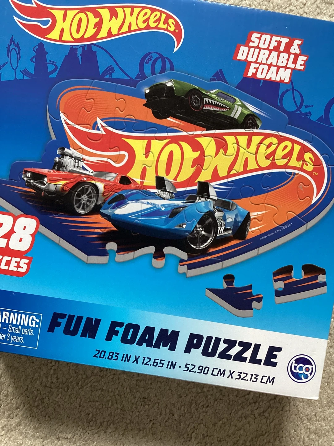 This is a Hot Wheels fun foam puzzle with 28 pieces. It's made from soft and durable foam. Puzzle dimensions are 20.83 in x 12.65 in.