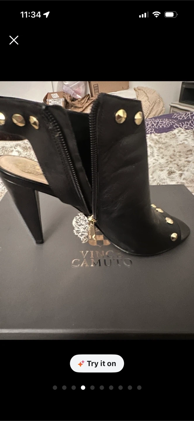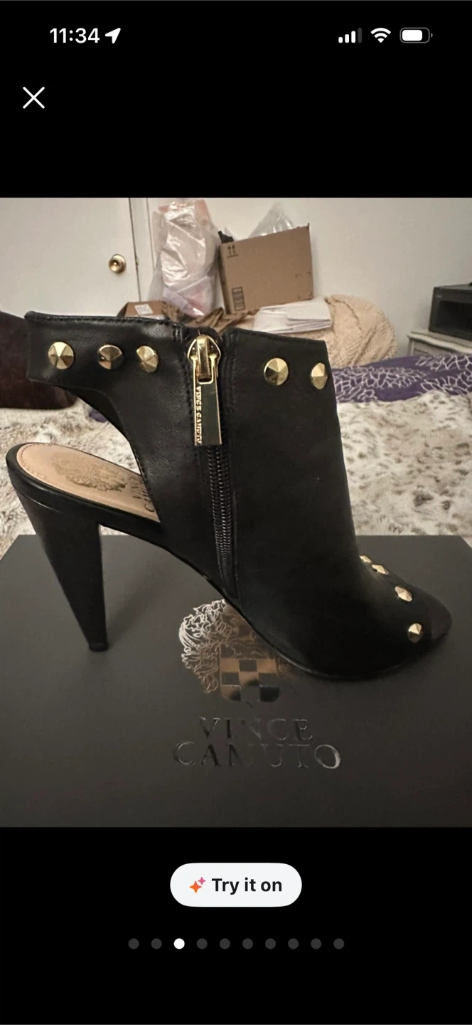 Vince Camuto black leather peep-toe heels with gold stud details. Side zipper closure for easy wear. Comes with original box. Worn only a couple times, shoes are in near mint condition, zippers functional, no rips in the leather gold hardware has no tarnishing. Smoke free home.
