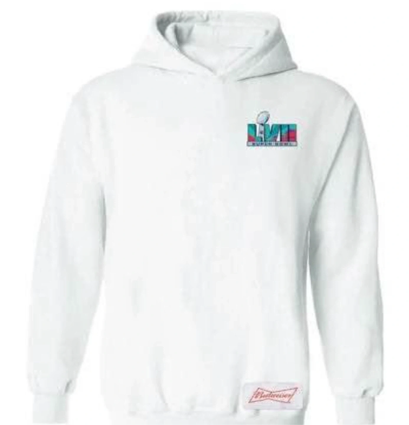 White hoodie celebrating Super Bowl LVIII. Features the official Super Bowl LVIII logo on the chest and a Budweiser patch near the hem. It's a comfortable pullover style with a hood and long sleeves.