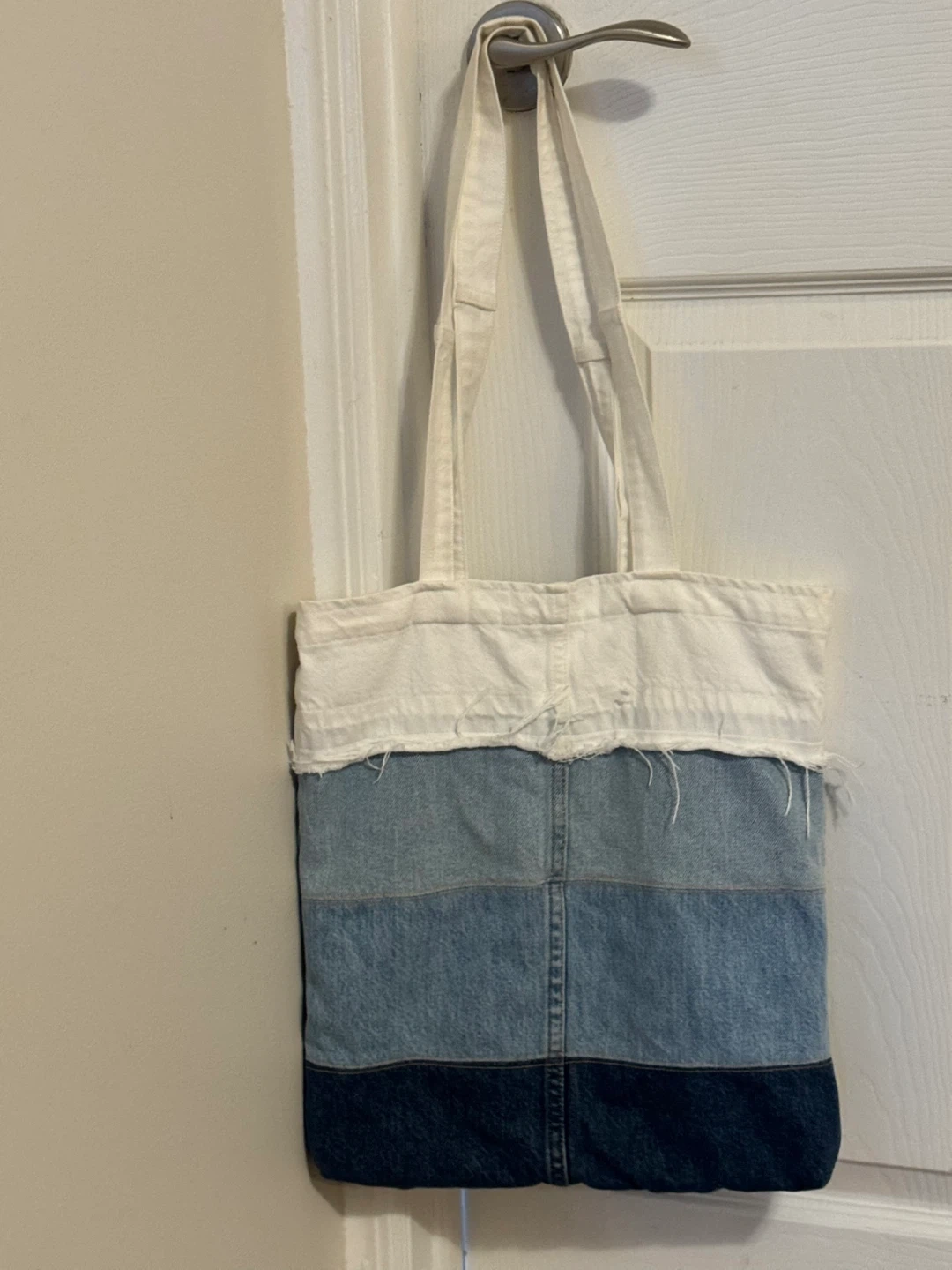 This tote bag features a patchwork design with varying shades of blue denim. It has white canvas straps and a white top section with distressed detailing. A unique, handmade look for everyday use!