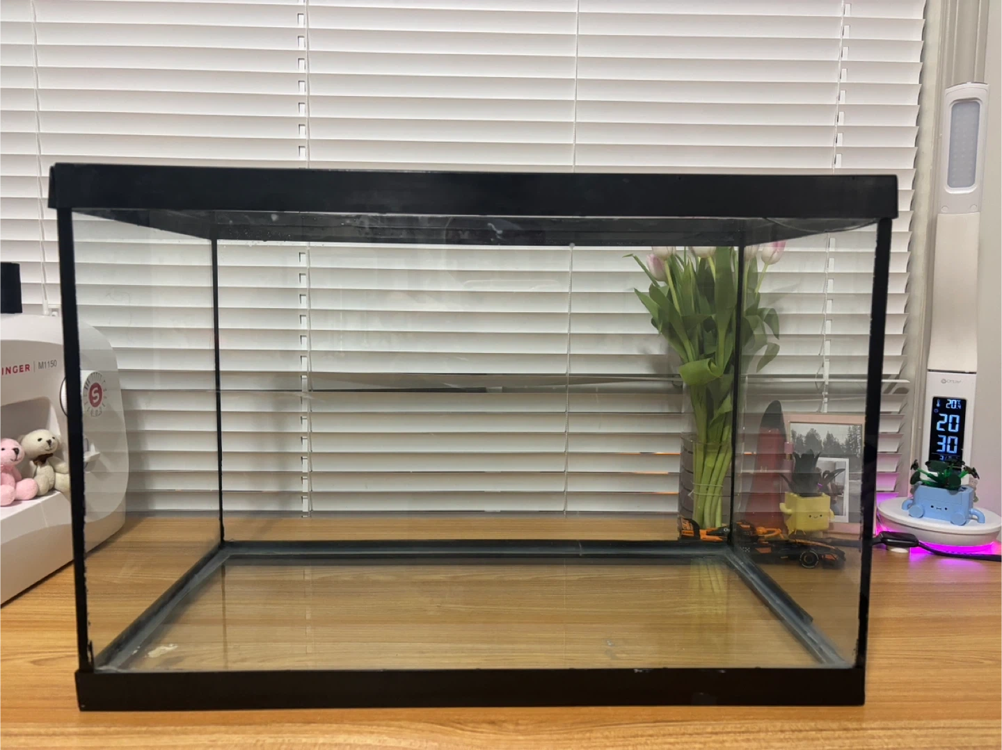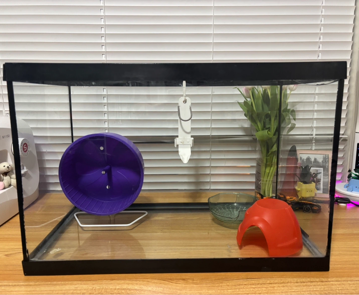 This is a glass aquarium tank. It comes with a purple wheel, a red dome hideout, sаnd bathroom and a water bottle dispenser. Great for small pets like hamsters!