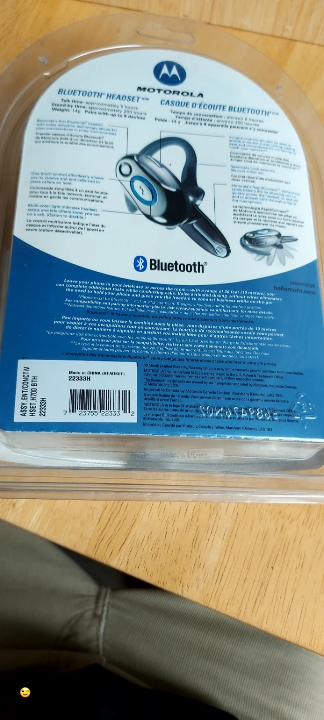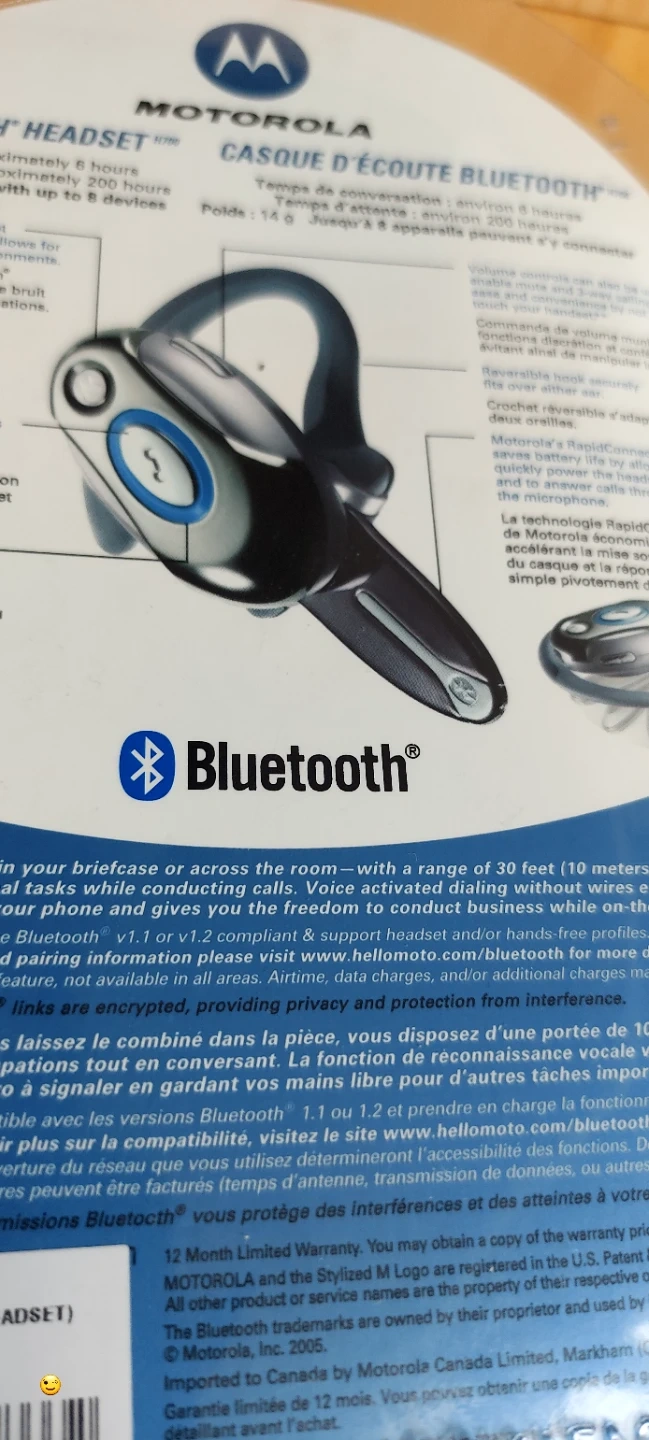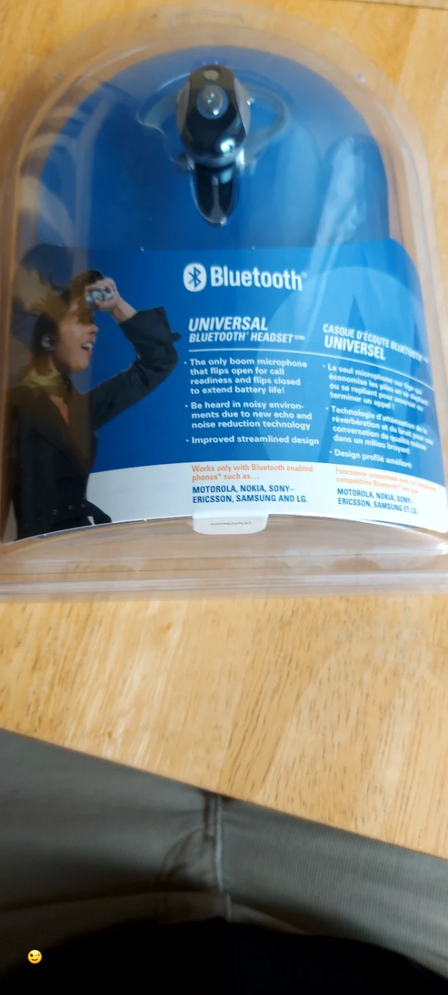 Motorola Universal Bluetooth Headset with noise reduction technology. Connects up to 2 devices and offers up to 8 hours of talk time. Voice activated dialing is supported. It's designed for hands-free communication.