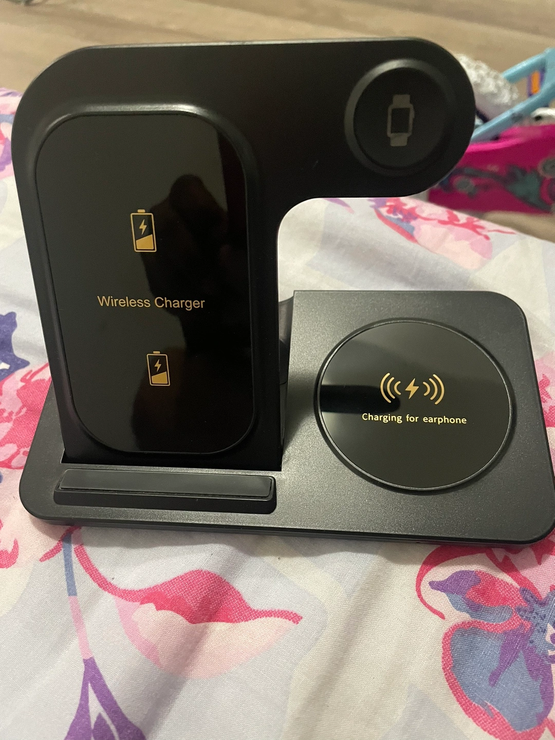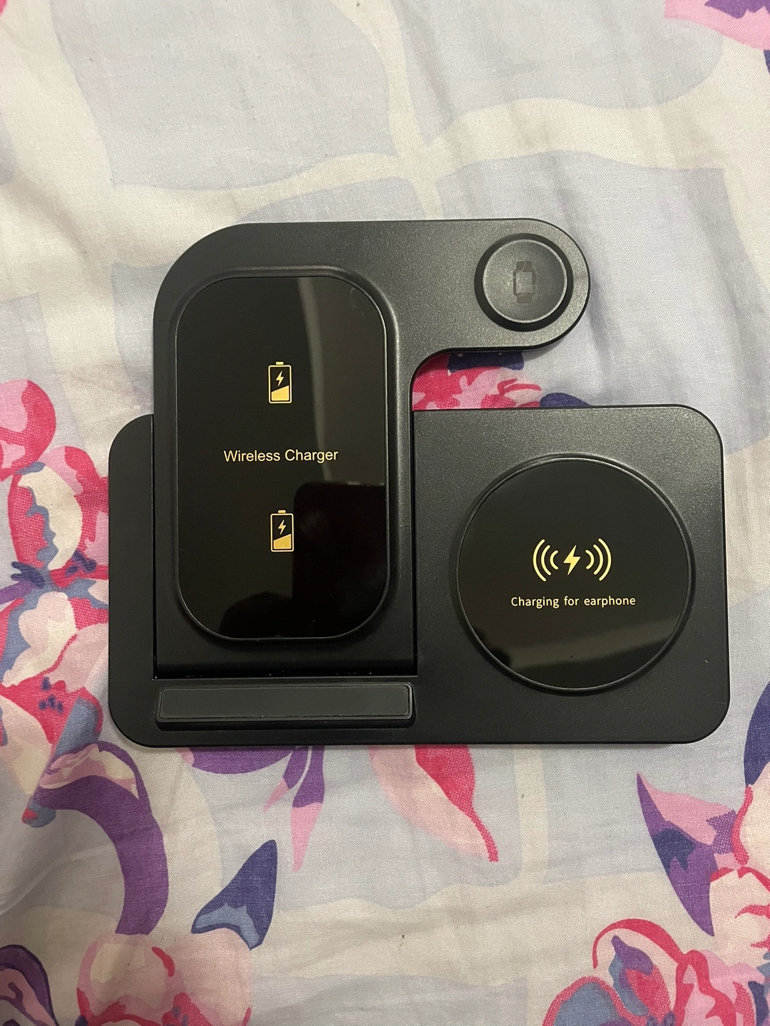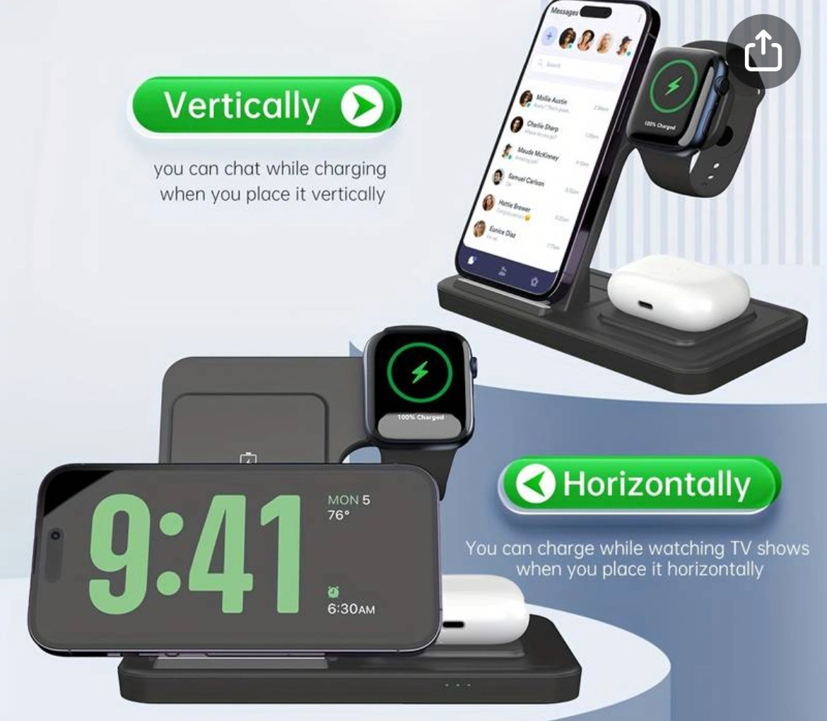 This 3-in-1 wireless charger can be used to charge your phone, watch, and earphones at the same time. It can be used in both portrait and landscape orientations. It's great for charging multiple devices at once.