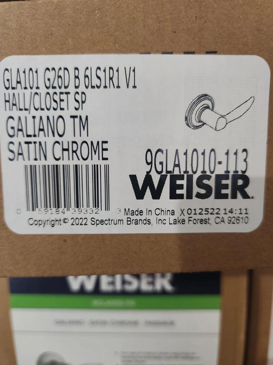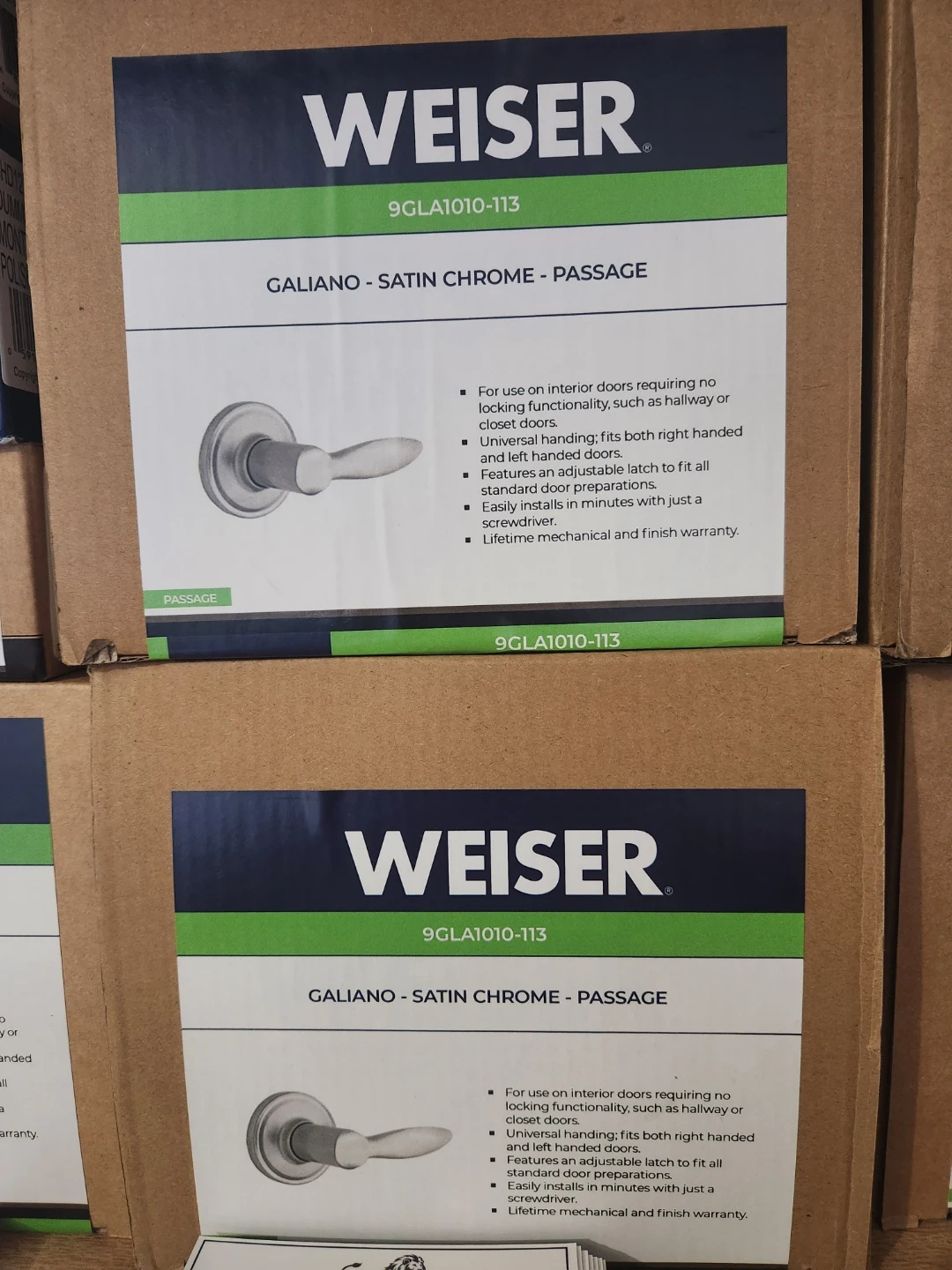Brand new Weiser Galiano passage lever set. Features a satin chrome finish and universal handing for right or left-handed doors. Easy installation with just a screwdriver. Lifetime mechanical and finish warranty included.
