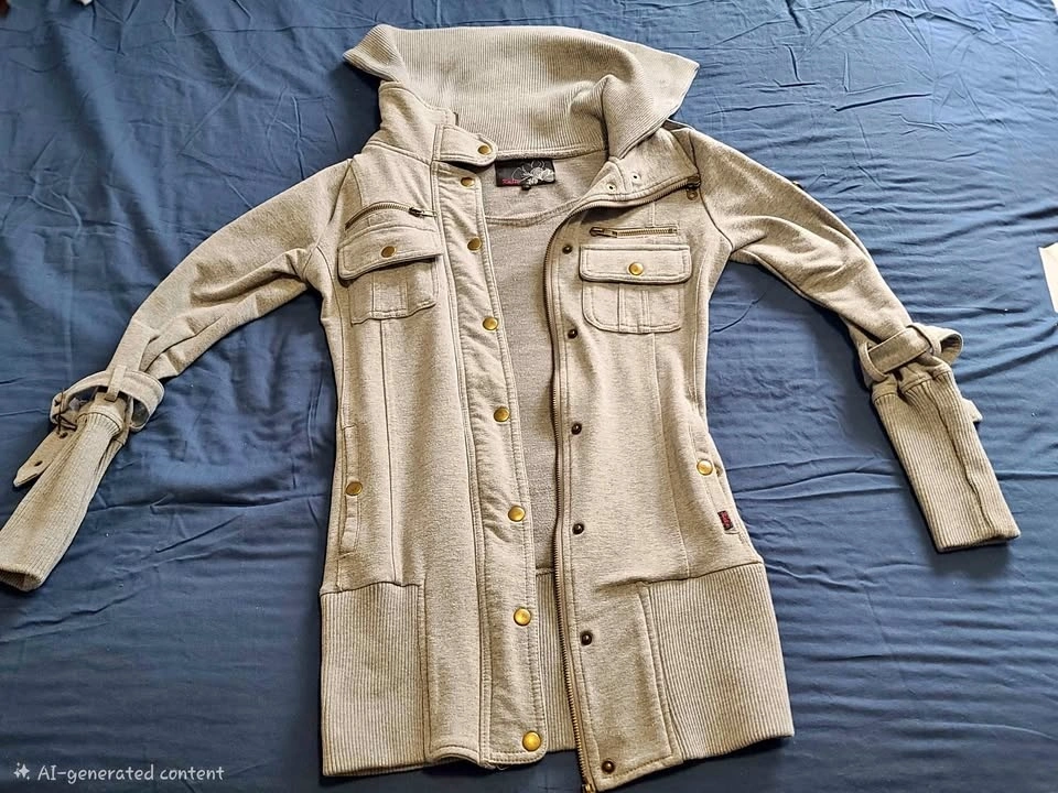 Stylish light grey long coat in good condition. Soft and comfortable fabric with ribbed cuffs and hem. Features front zipper with snap buttons, multiple pockets, and adjustable sleeve straps. Warm and perfect for fall/spring.