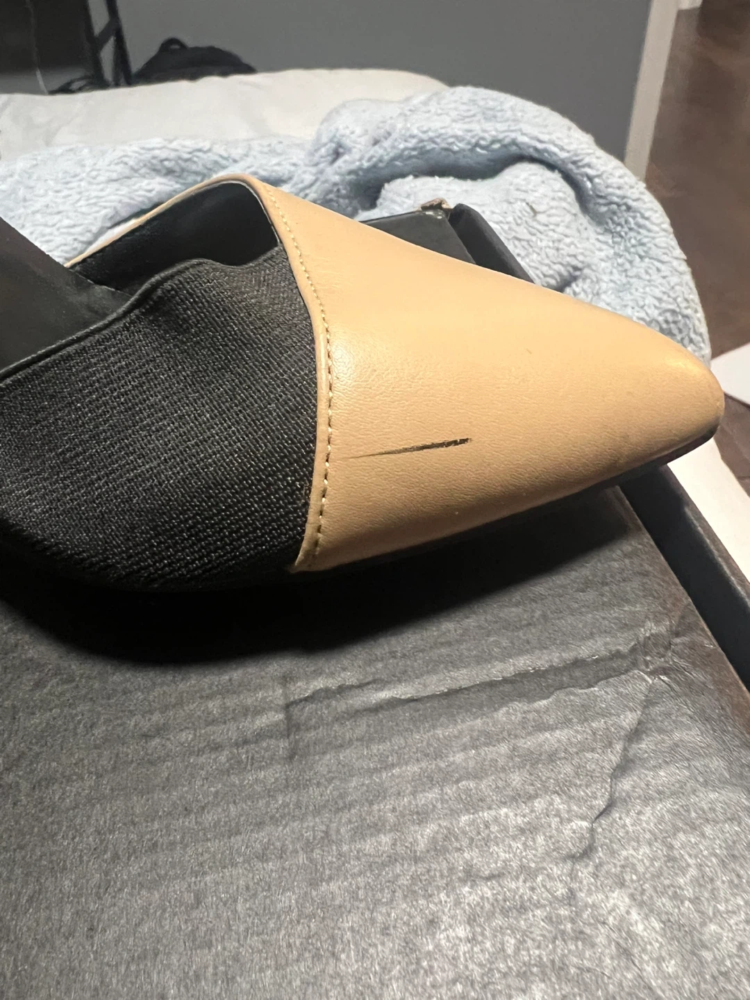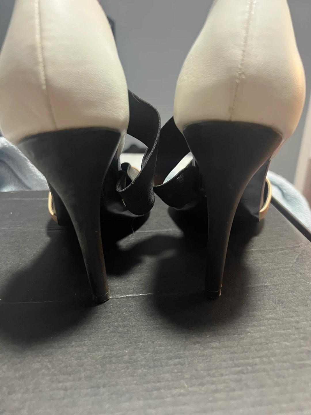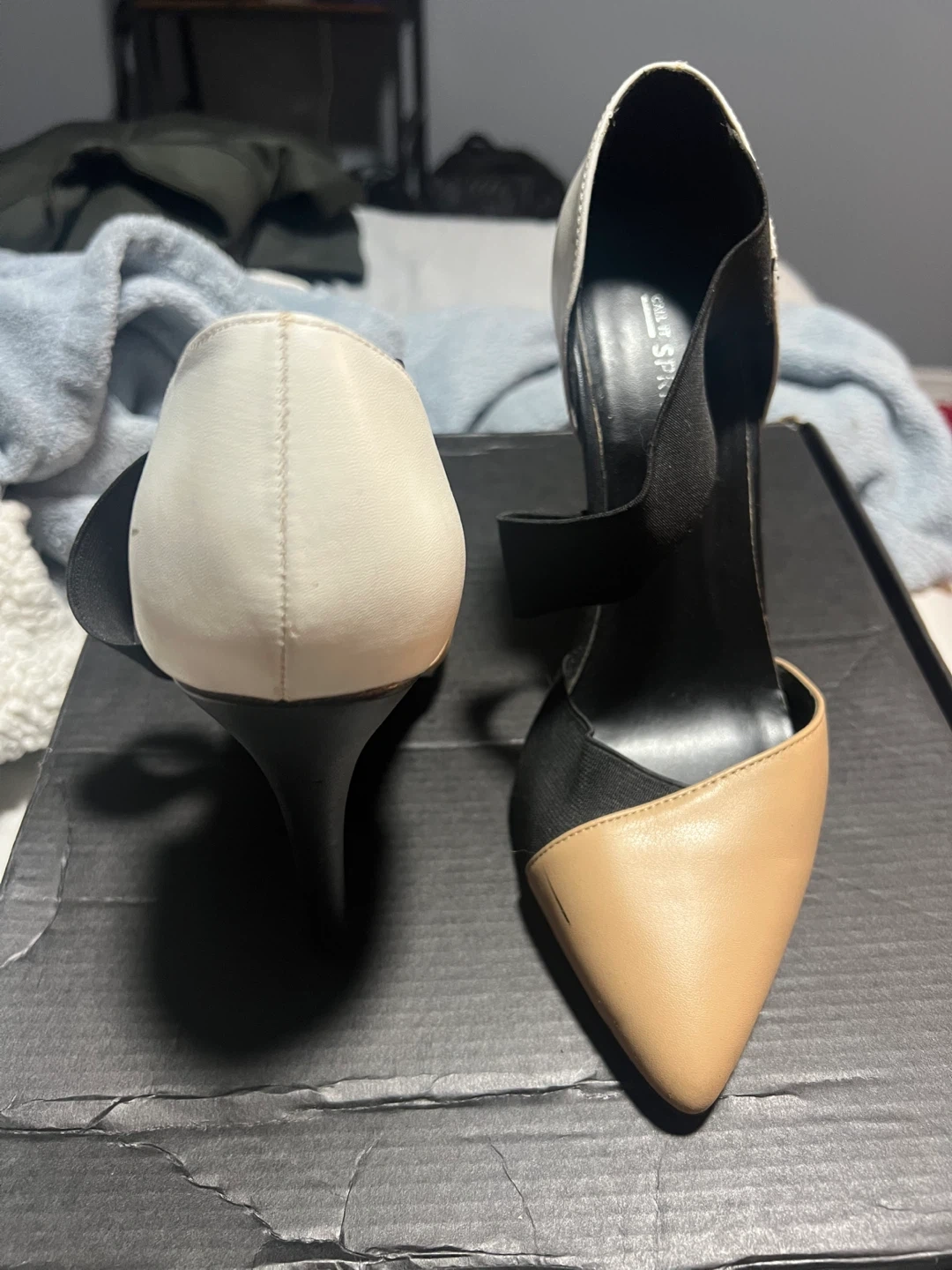 These stylish heels feature a black fabric and faux leather upper with beige and white accents. They have a classic pointed toe and a strappy design. Please note there are minor scuffs on the toe and heel area. Heel height is approximately 3.5 inches.