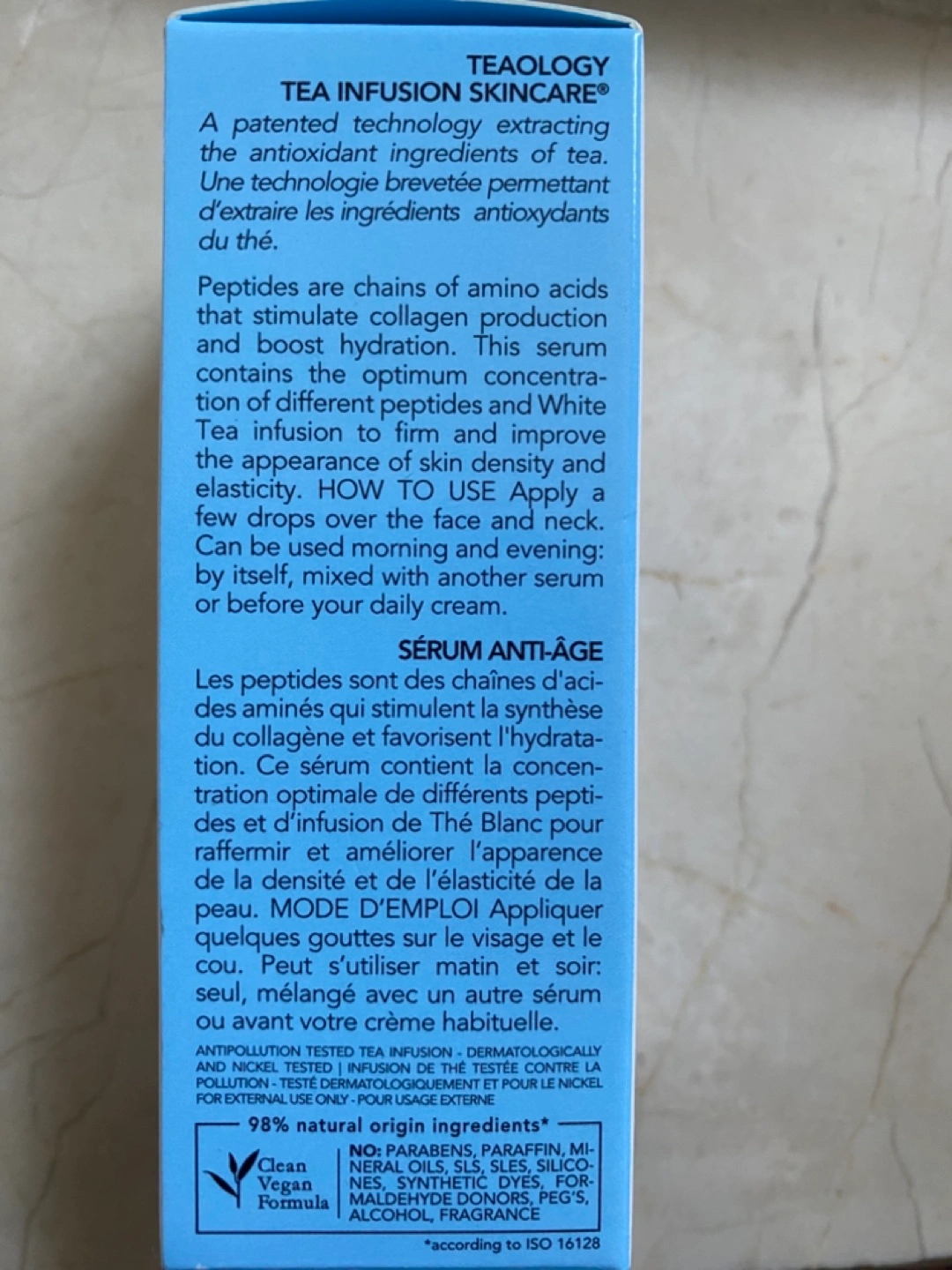 Teaology Peptide Infusion Anti-Aging serum! It contains white tea and advanced peptide complex. This serum comes in a 15ml (0.5 fl.oz) bottle and is made in Italy. It's designed to firm and improve the appearance of skin density and elasticity. Apply a few drops over the face and neck, either by itself or mixed with your daily cream
