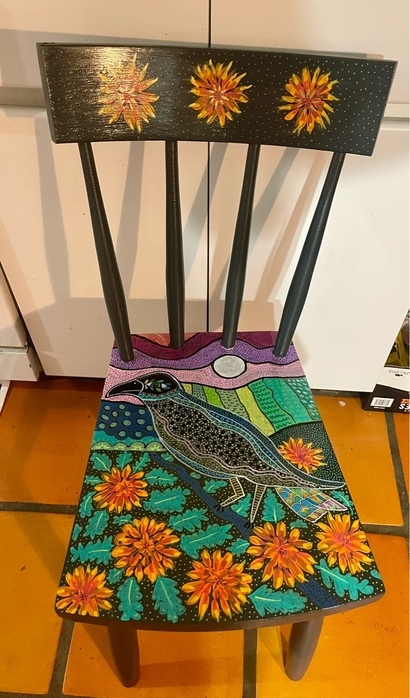 This accent chair features a unique hand-painted design with a bird, flowers, and a moonlit landscape. The seat and backrest are adorned with vibrant colours and intricate patterns. It's a great conversation piece for any room!