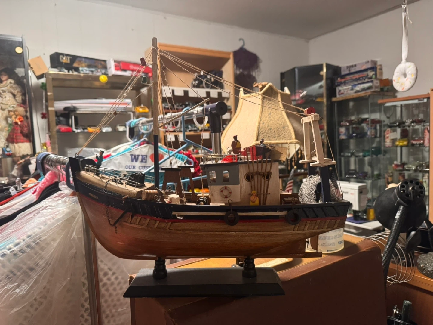 A detailed wooden model of a fishing boat, featuring intricate rigging and deck details. It's mounted on a display stand. This model would make a great addition for any maritime enthusiast!