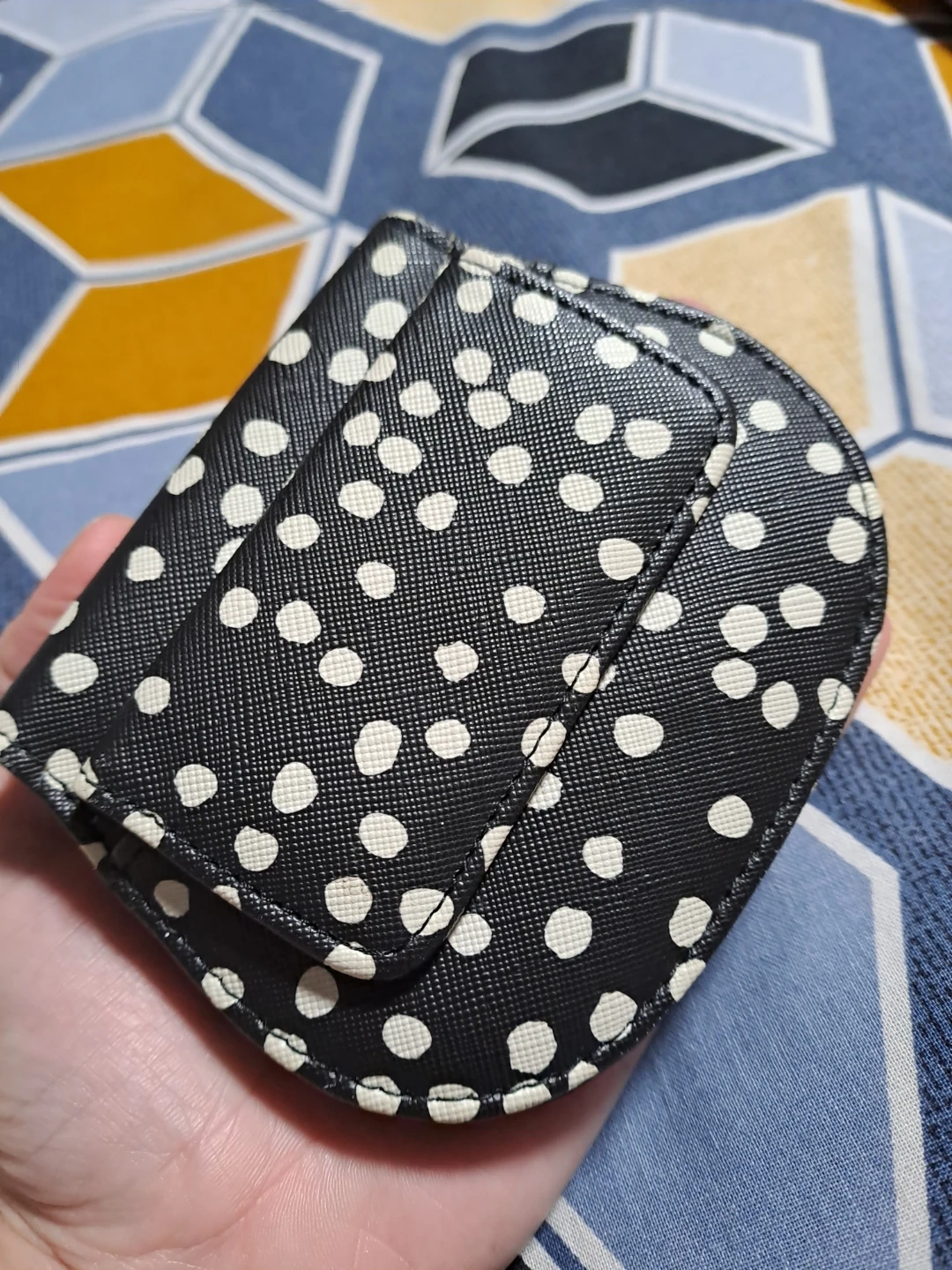 A cute little coin purse with a black and white polka dot exterior. It's made from a durable, faux-leather material. Interior has a few card slots and a snap closure. It's perfect for holding loose change or cards!