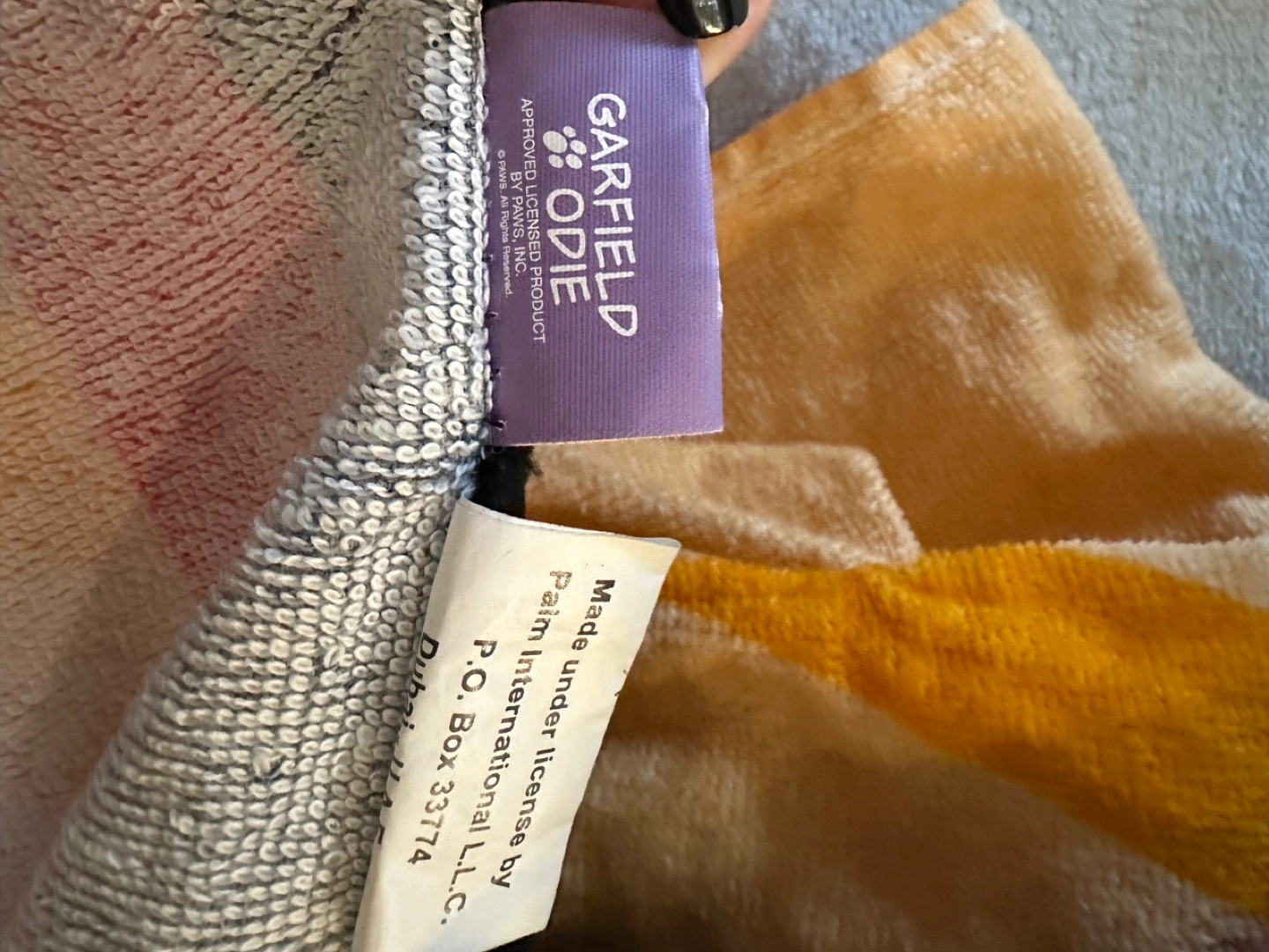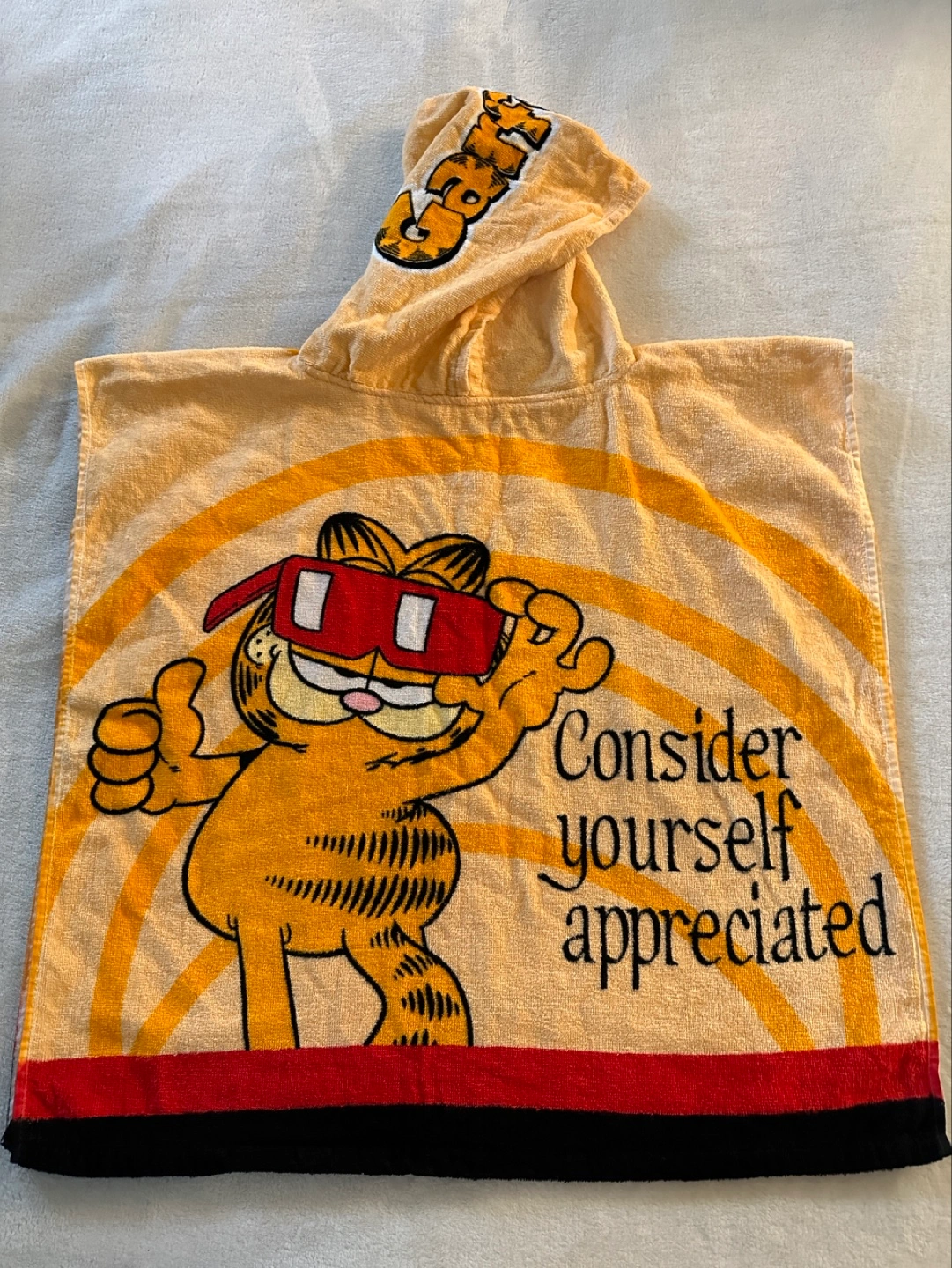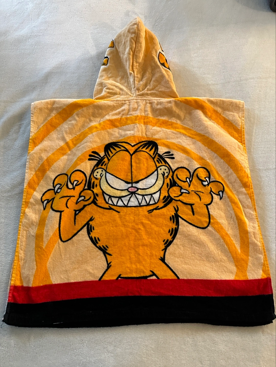Kids' hooded beach towel. Features Garfield cartoon character. Soft, absorbent material. Great for the pool or beach.