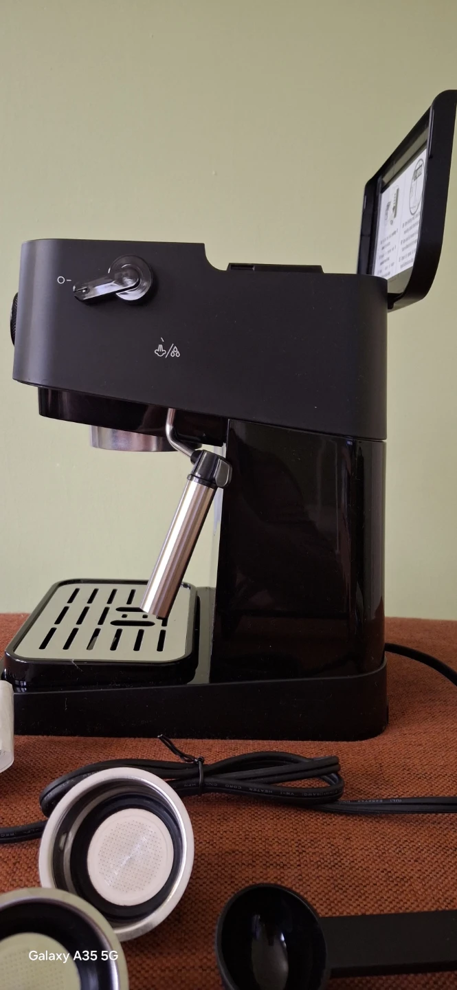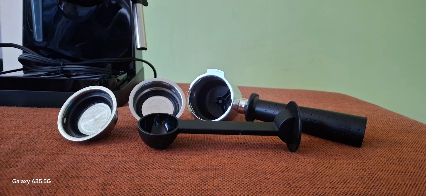 This is a black DeLonghi espresso machine. It includes a portafilter, two filter baskets, and a scoop. Makes delicious coffee at home.