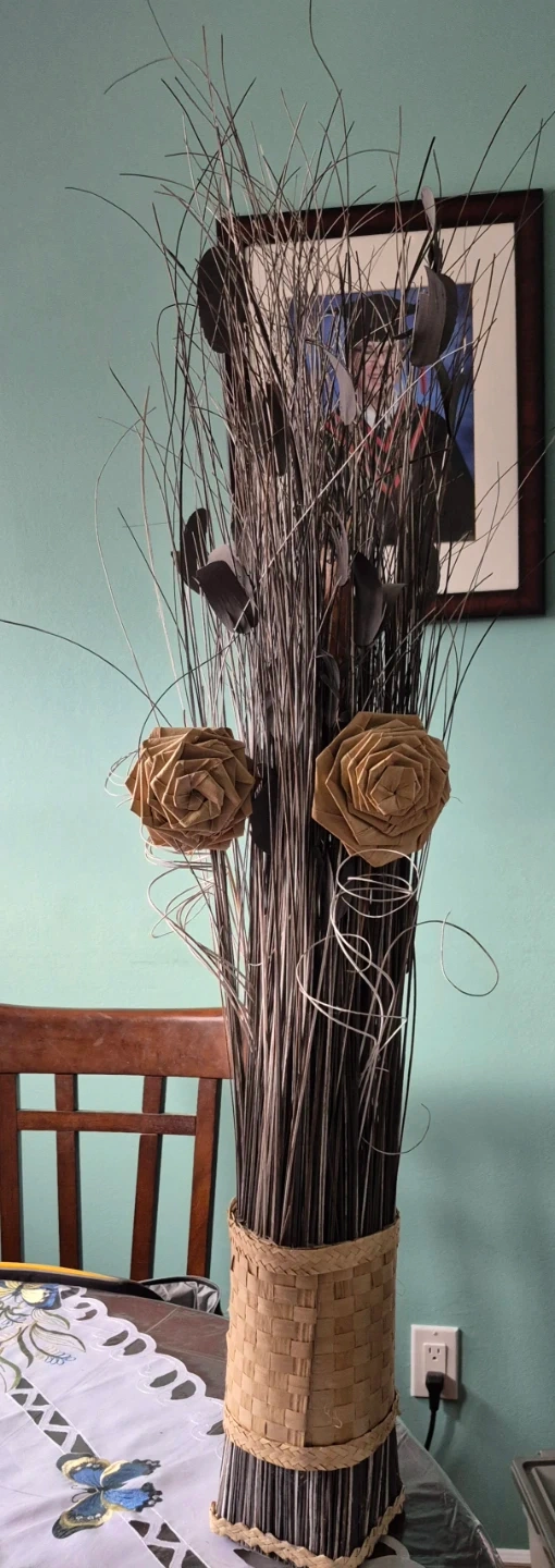 This decorative arrangement features dried grasses and two paper flowers. It's housed in a woven basket base. Adds a natural touch to any room.