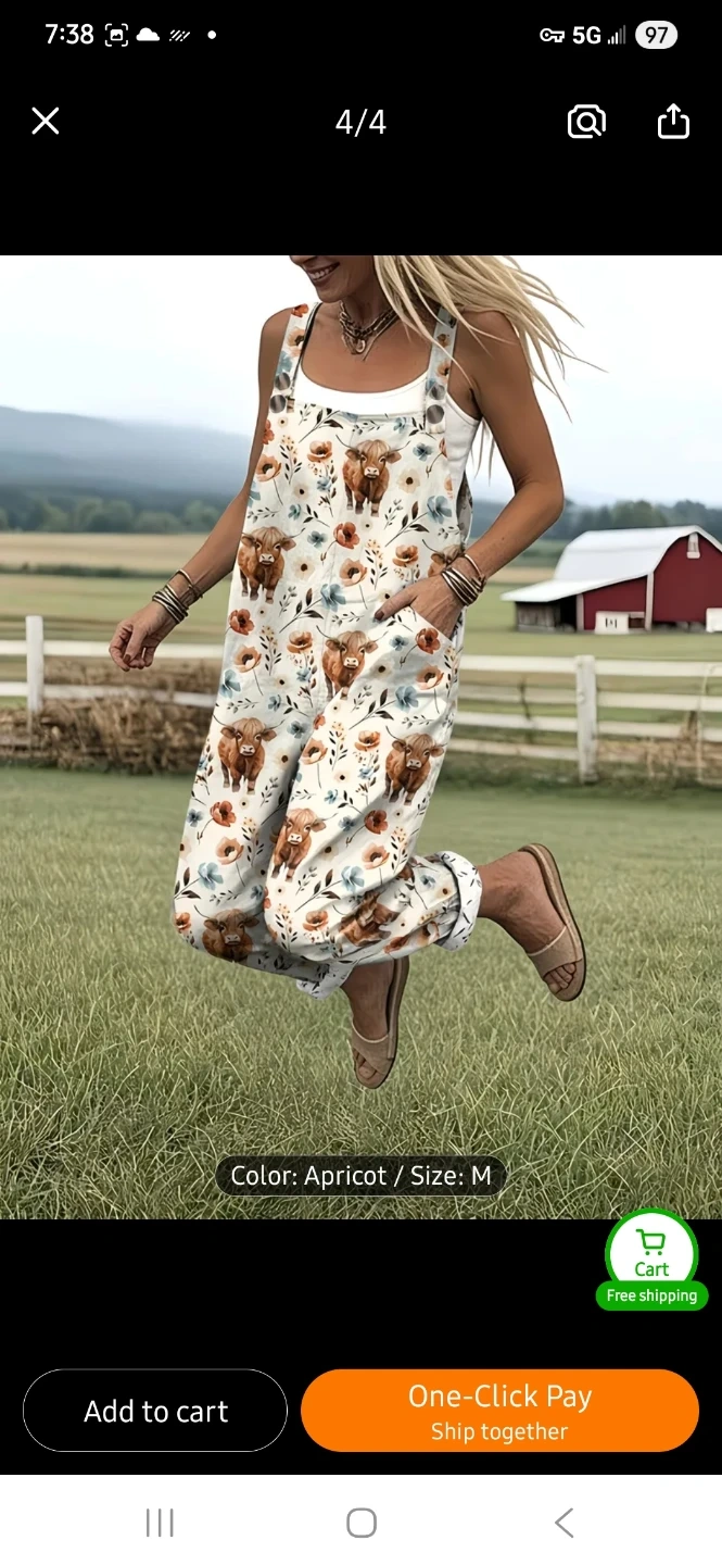 These women's overalls feature a cute highland cow and floral print. They're apricot coloured and comfortableto wear. It has adjustable straps and pockets.
