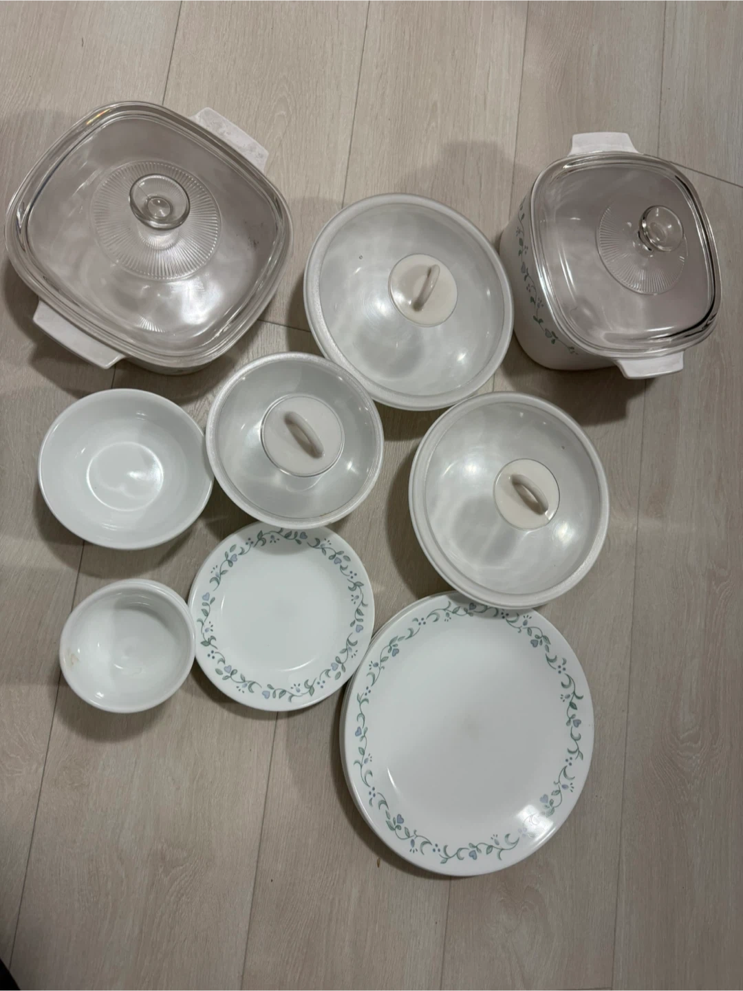 This Corelle set includes 36 pieces sets. It's ideal for serving and storing food. Dishware is white with a delicate blue floral pattern.