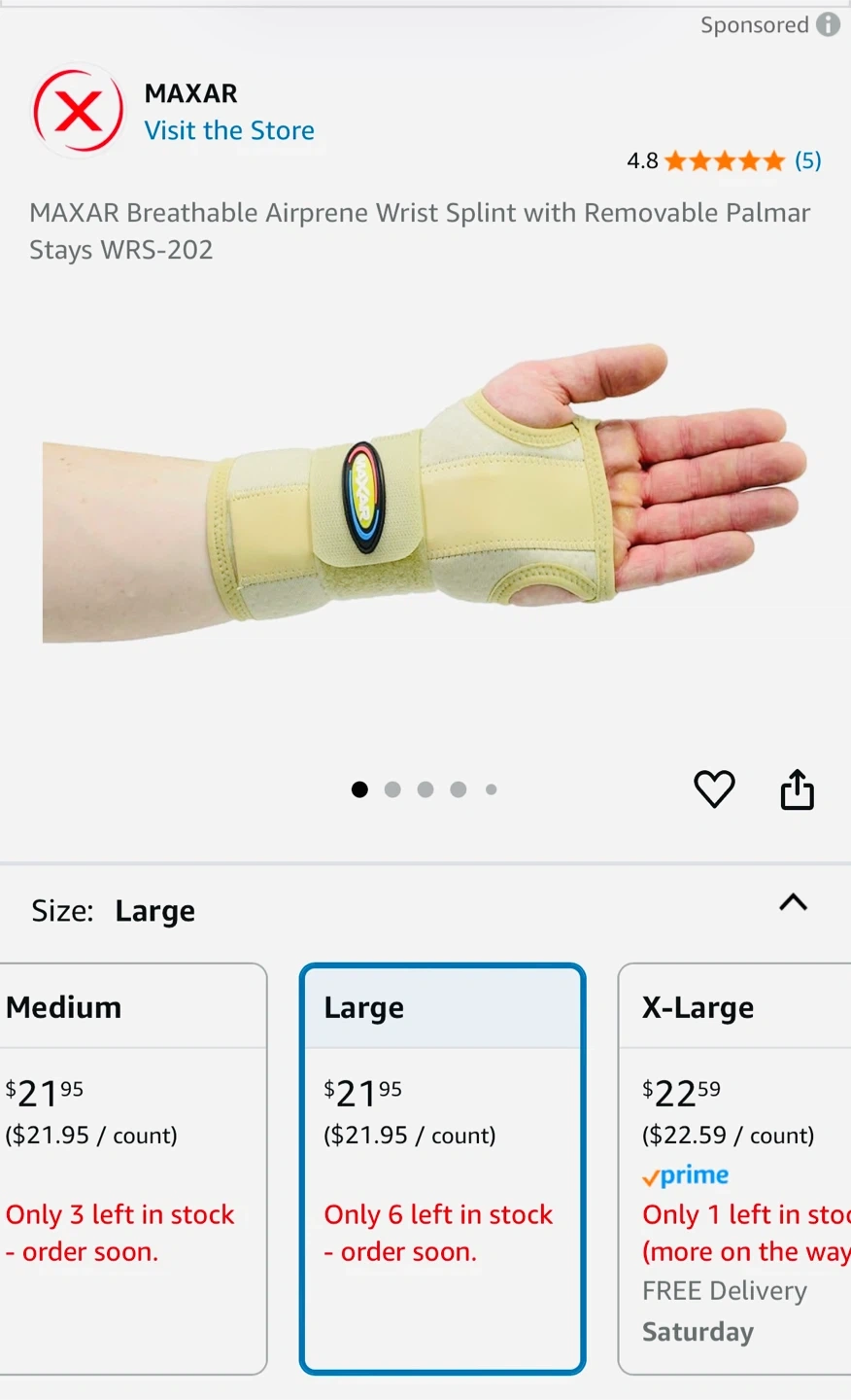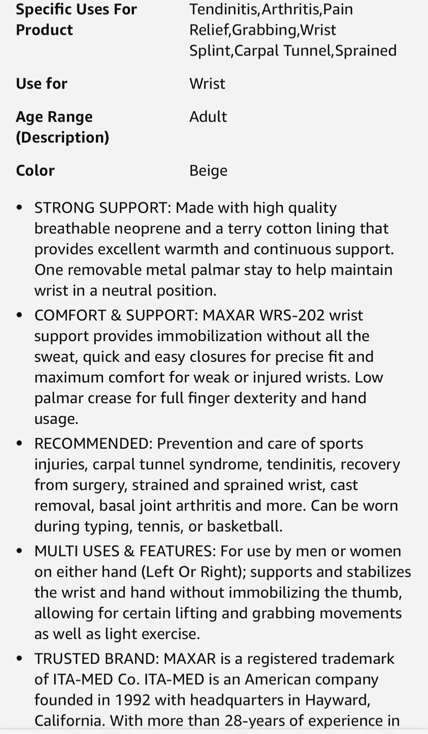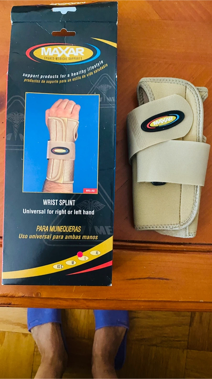 MAXAR WRS-202 wrist splint for support and immobilization. Made with breathable neoprene and terry cotton lining. Features a removable metal palmar stay for neutral wrist positioning. Quick and easy closures for precise fit. Adult size, large, in beige.