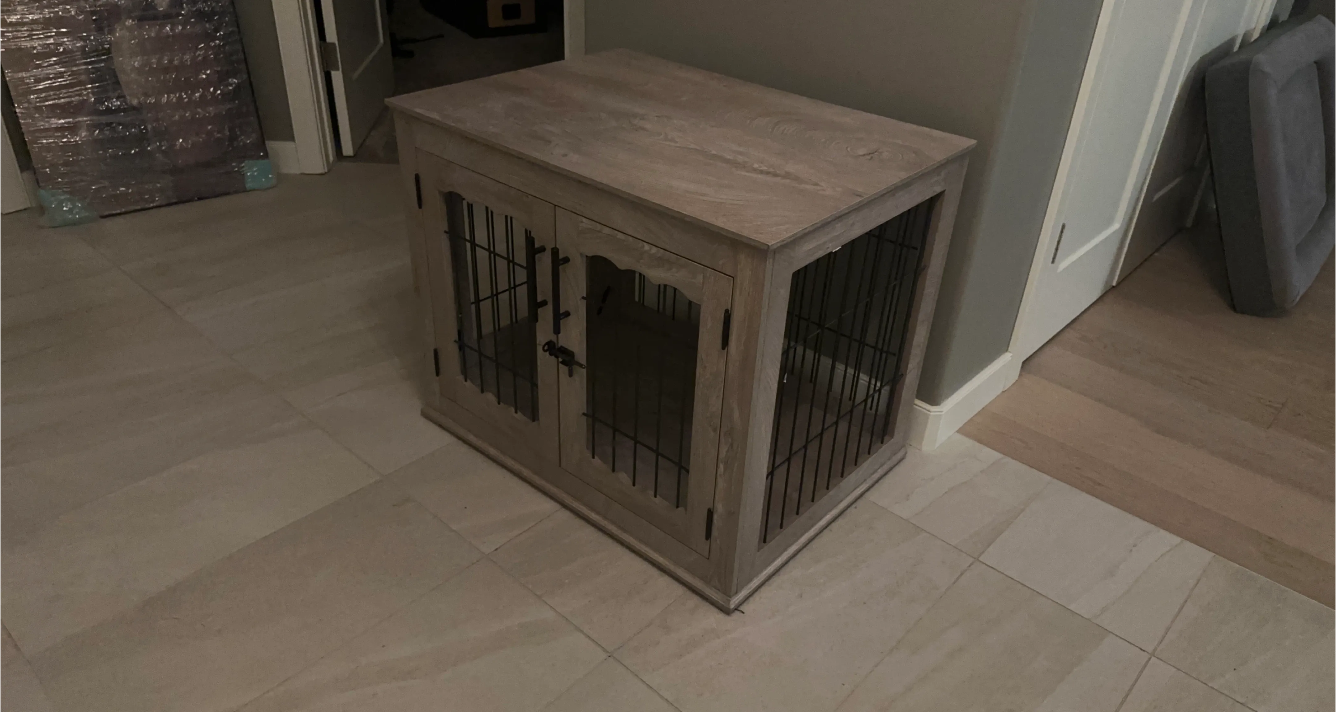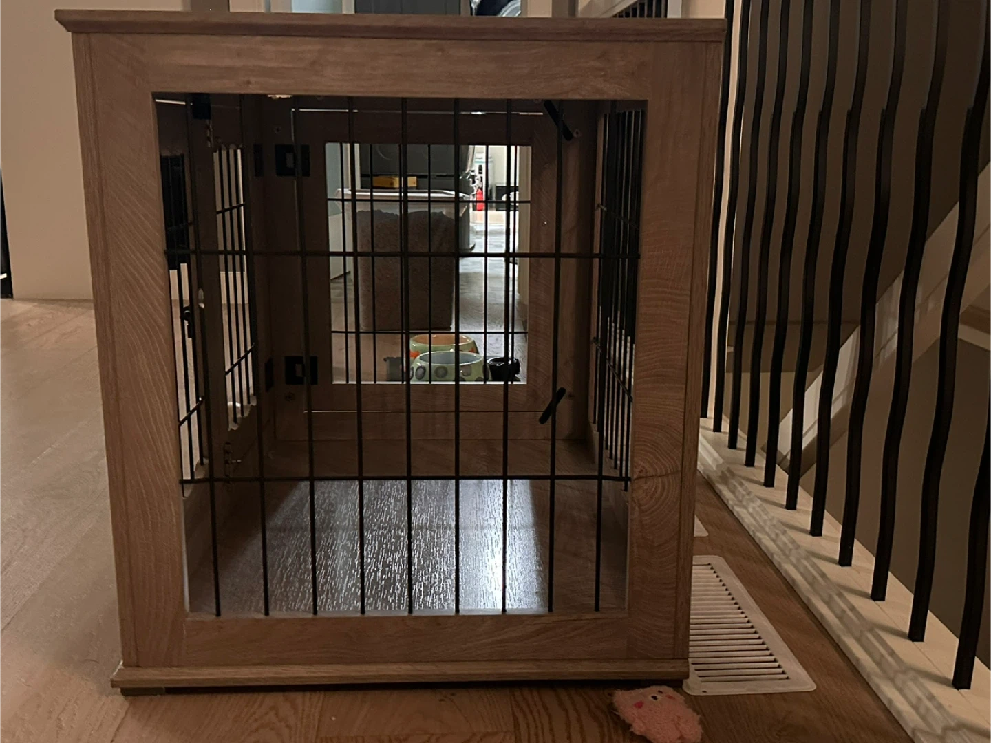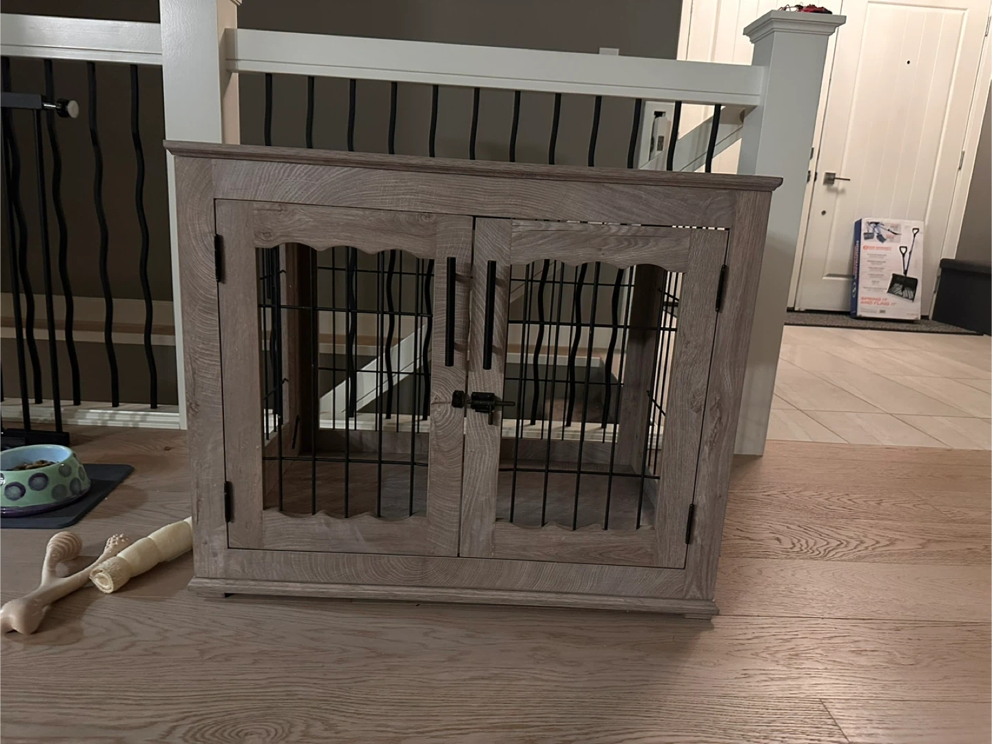 This wooden dog crate doubles as a stylish end table. It features a durable wood construction with wire caging for ventilation. The triple doors offer easy access for your pet. It's suitable for small to medium-sized dogs.