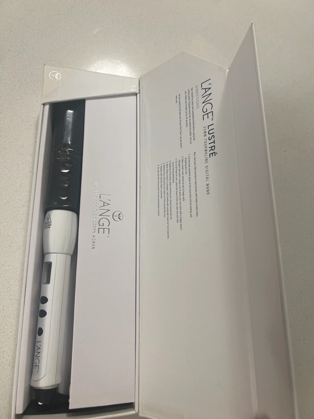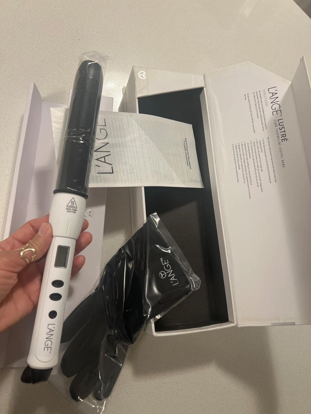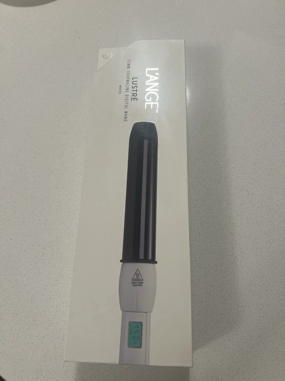 LANGE Lustré 32mm Tourmaline Digital Wand in white. Includes original box, instructions, and heat-resistant glove. Digital display shows temperature settings.