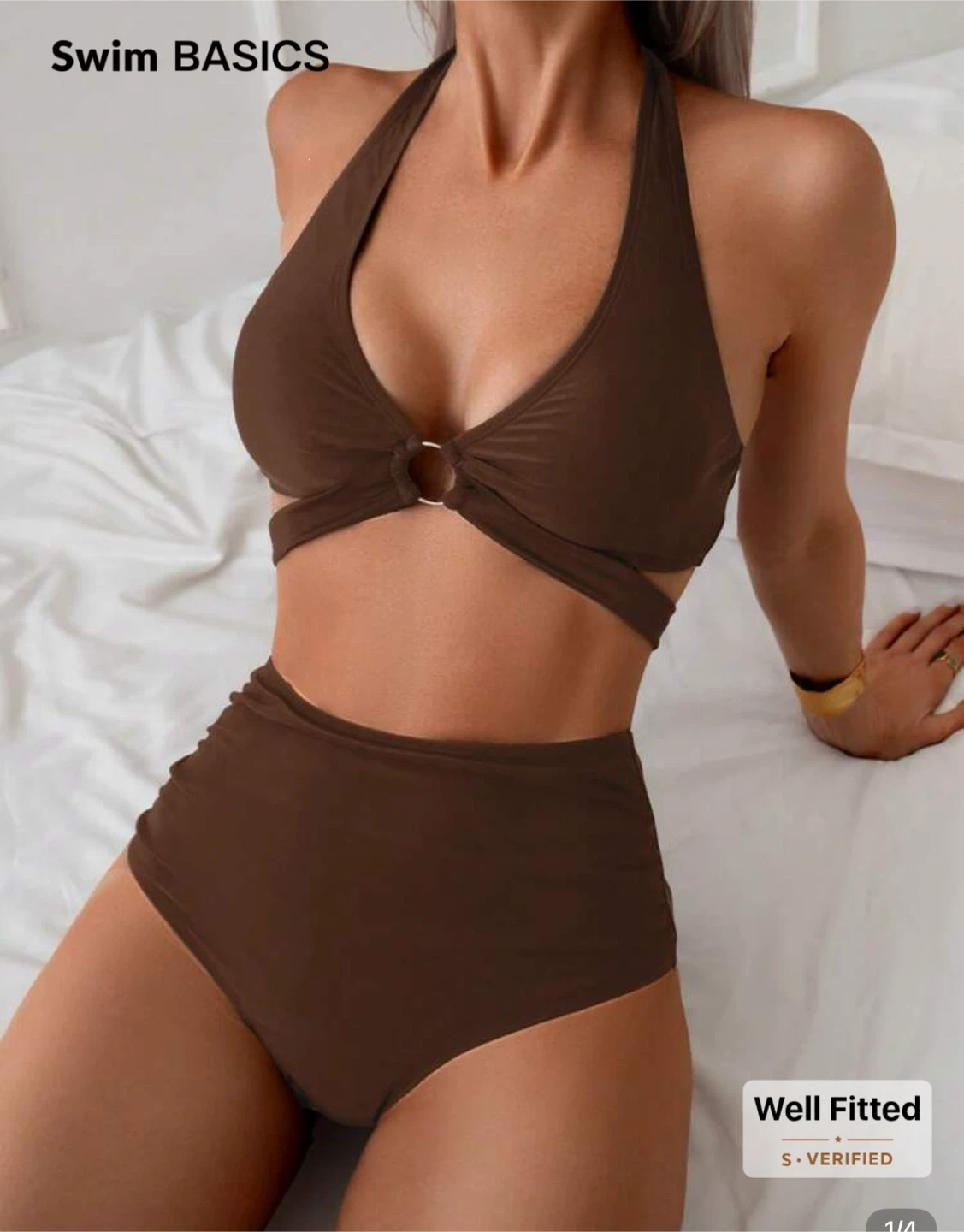 This Swim BASICS bikini set is a stylish brown halter top and high-waisted bottoms. It's a size small and offers a well-fitted look. Great for hitting the beach or pool!