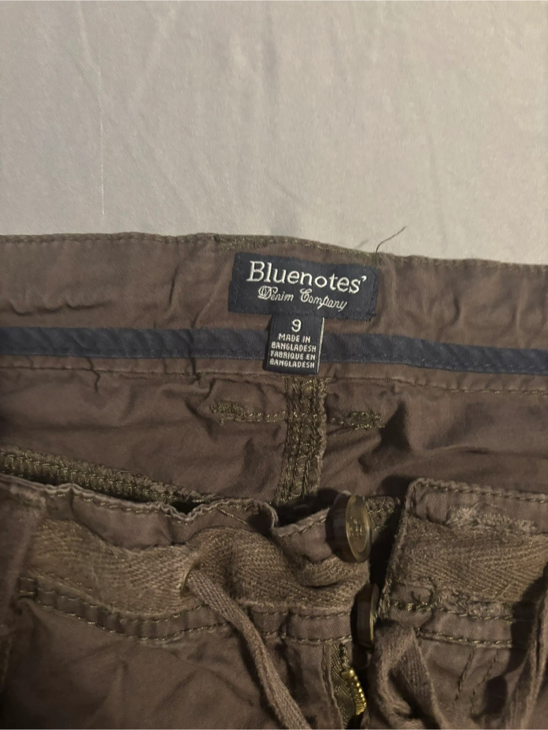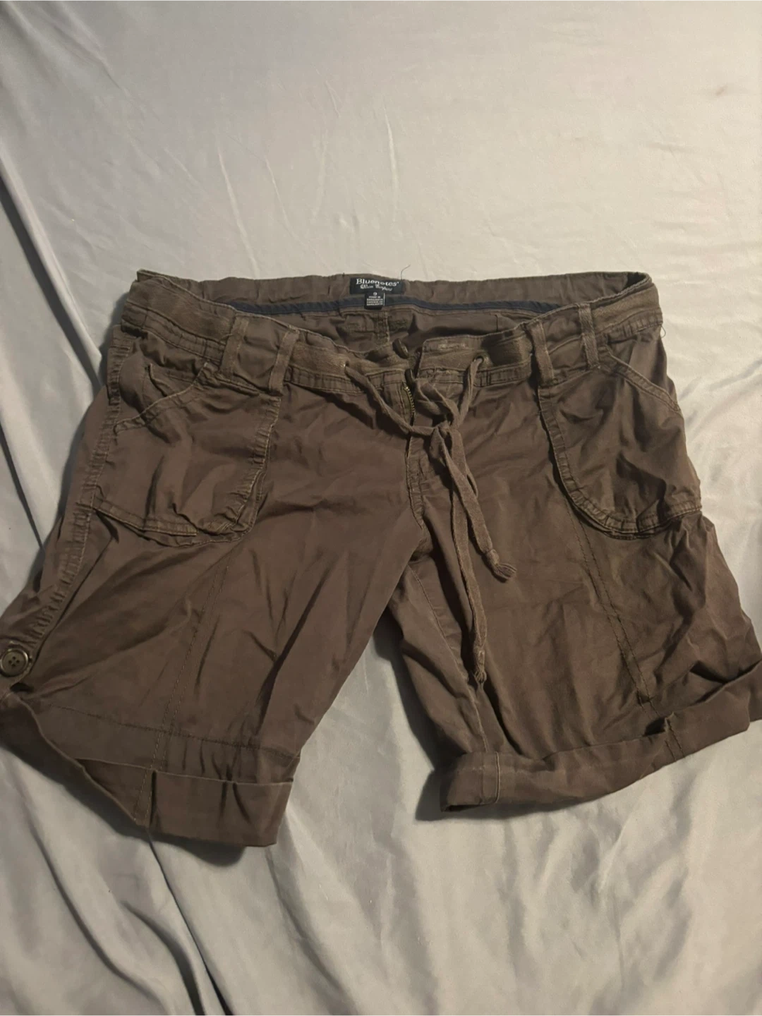 These are Blue Notes Denim Company cargo shorts in a size 9. They're a rich brown colour with multiple pockets and a drawstring waist. The fabric is a soft cotton blend.