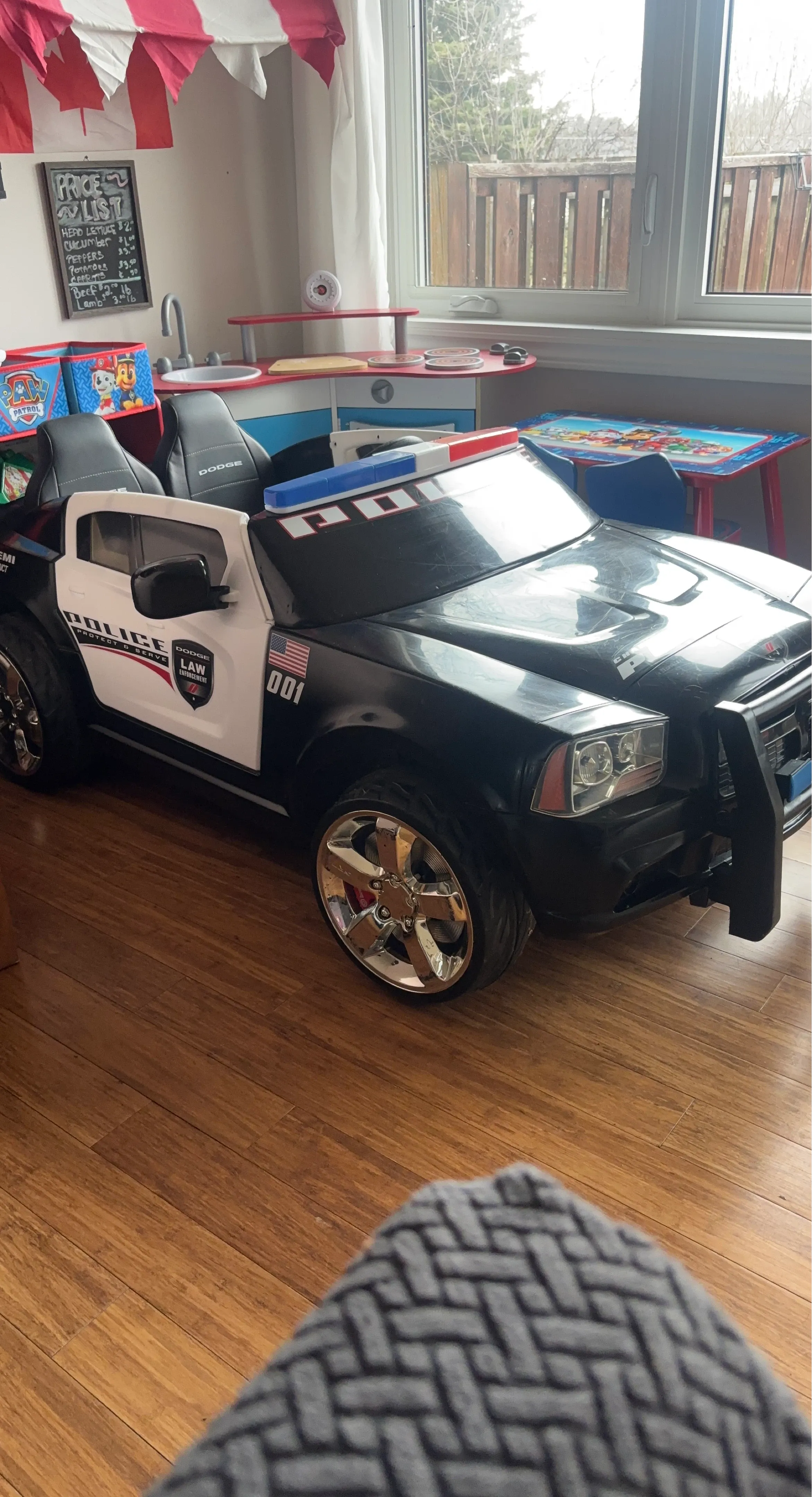 This is a black and white Dodge police ride-on car. It has working lights and siren sounds. It's a fun way for kids to play pretend cop!