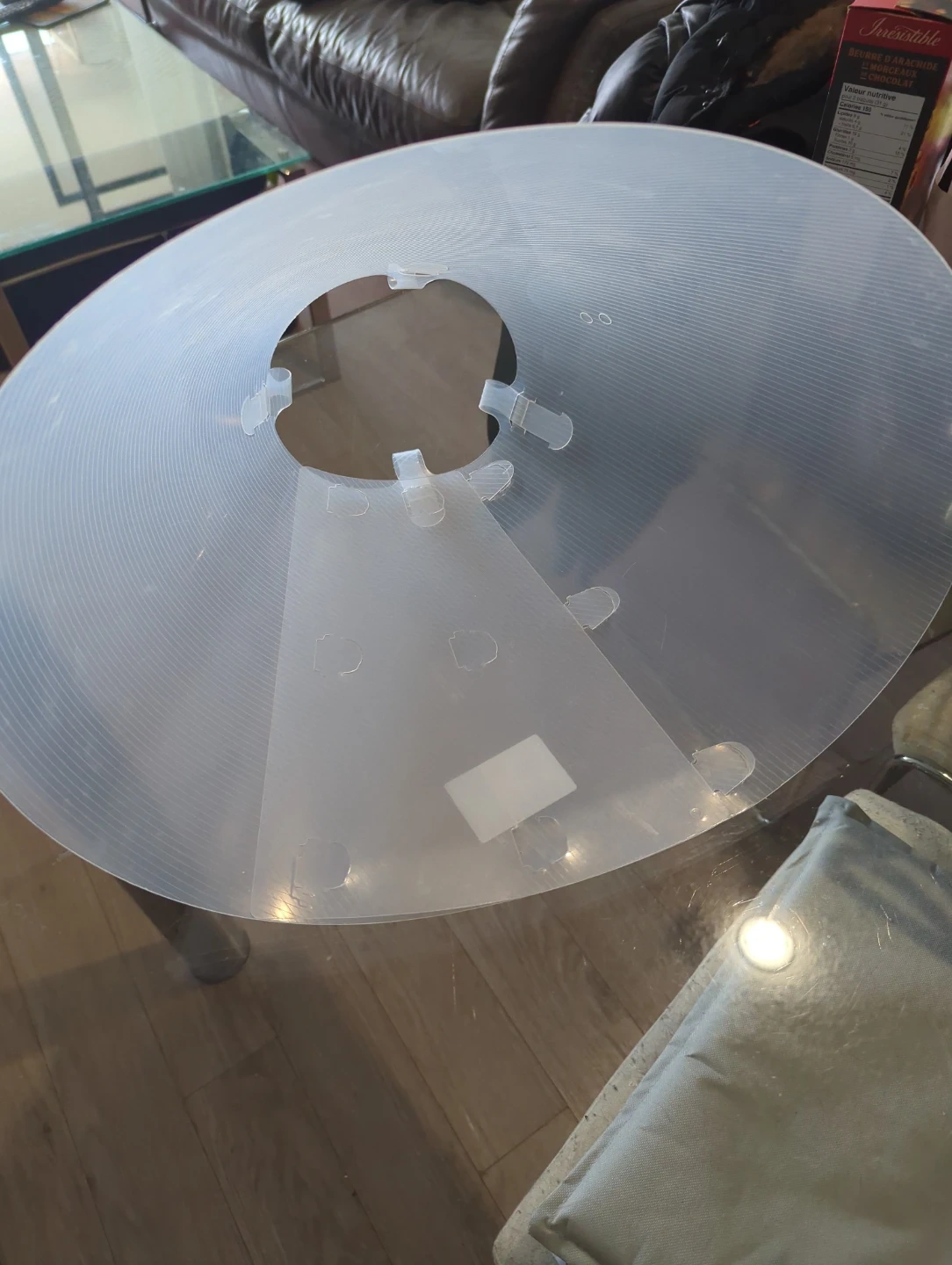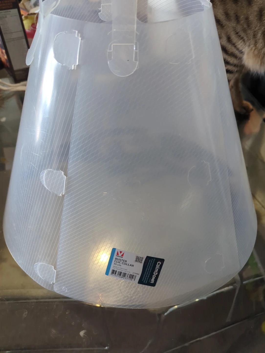 This is a Buster Dog Collar. It's made of clear plastic and has adjustable snaps for a secure fit. It's designed to prevent pets from accessing wounds or injuries.