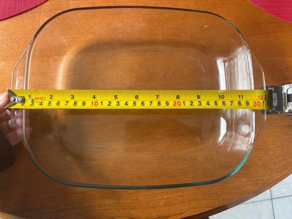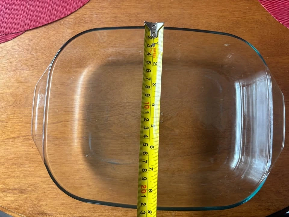 This Pyrex glass baking dish is a highly versatile cooking vessel equipped with a lid. It is suitable for preparing casseroles, roasting various foods, and even roasting a whole chicken. The dimensions of the dish are approximately 12 inches in length and 8 inches in width. Pick up in Keswick.