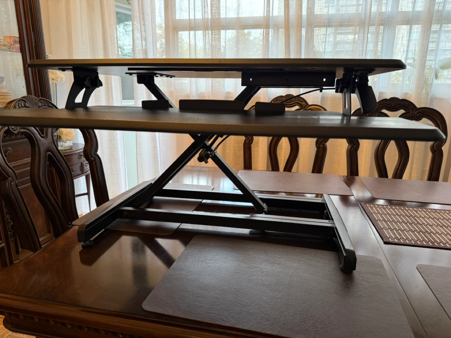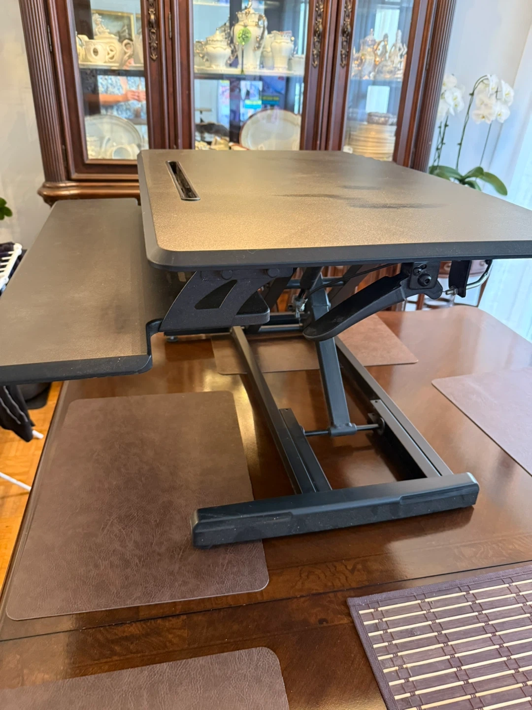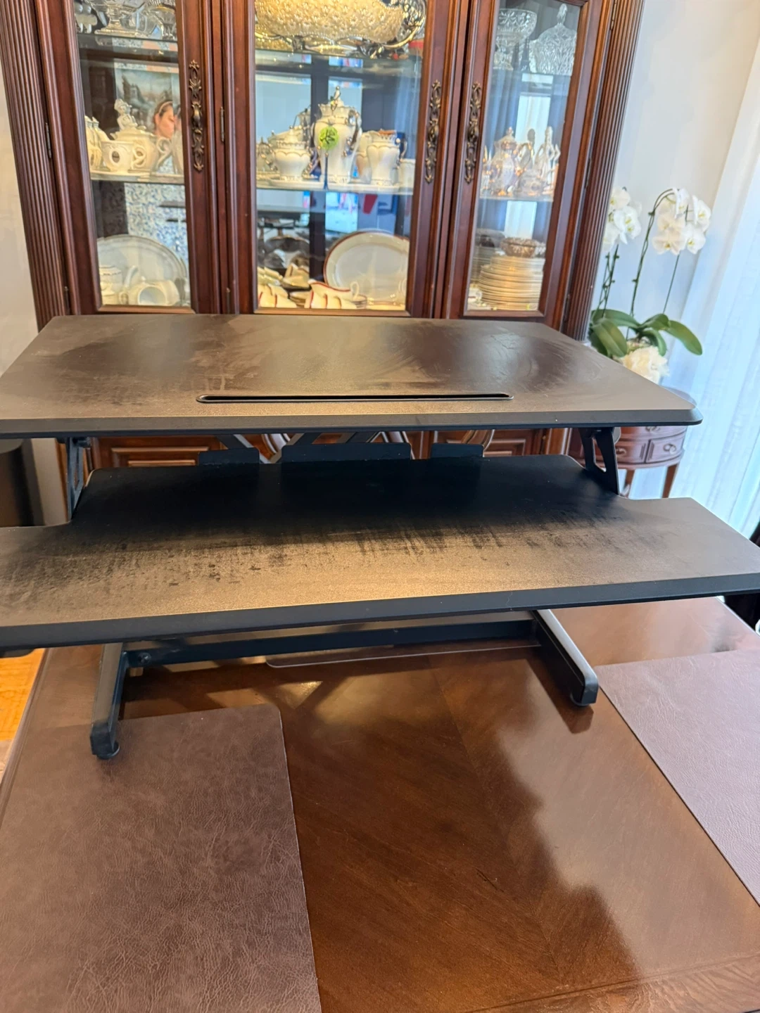 Selling a handy adjustable standing desk converter! It's in great shape and perfect for turning any regular desk into a standing workspace. It's a simple way to improve your posture and stay active while working from home!