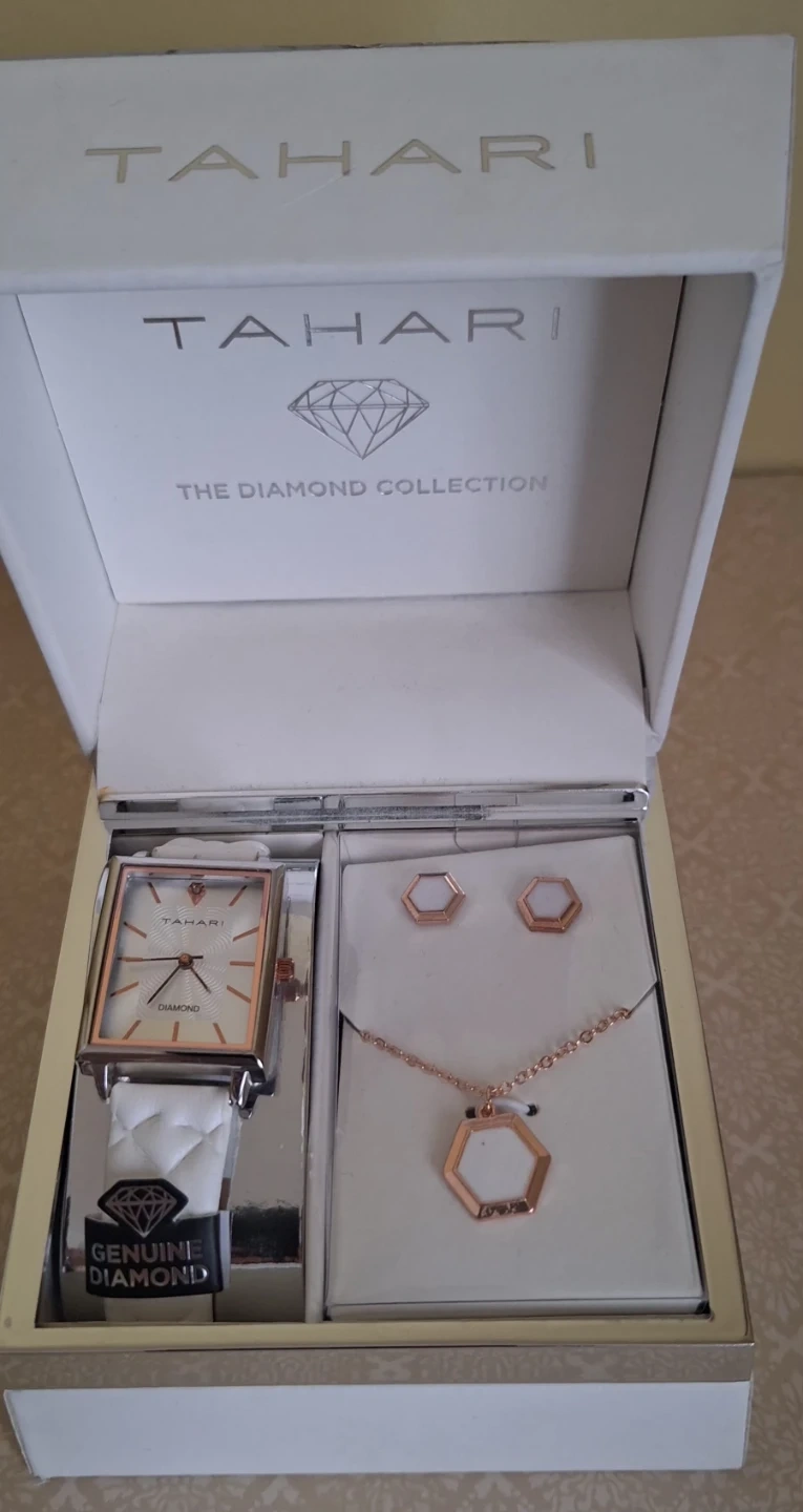 This Tahari "The Diamond Collection" set includes a white watch with matching necklace and earrings. NEW NEVER USED in original packaging.