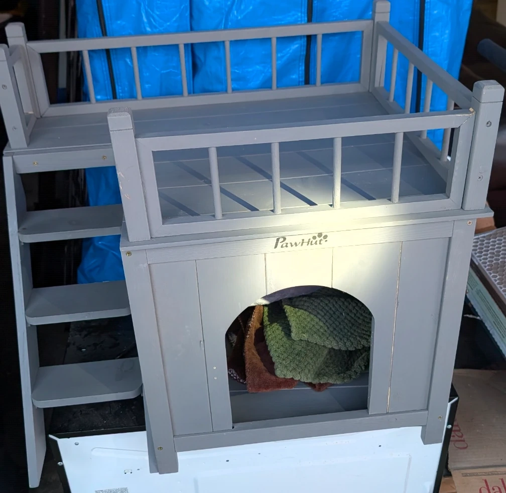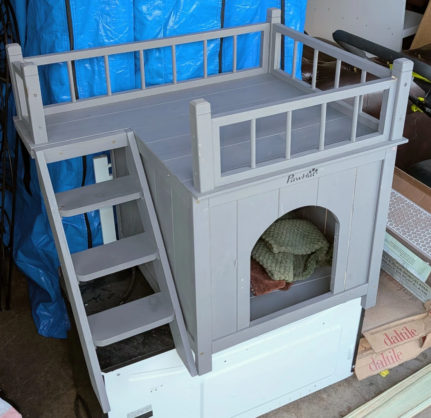 Gray wooden cat condo by PawHut. It's a two-tier design with stairs leading to an upper balcony. Features an enclosed lower den for privacy. Suitable for cats or small pets! My boys didn't use it.