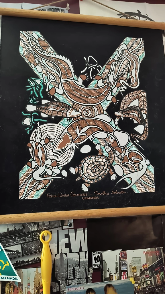 Aboriginal art print featuring various freshwater creatures. Artist: Timothy Johnston. Urim Birra. Wall hanging scroll.