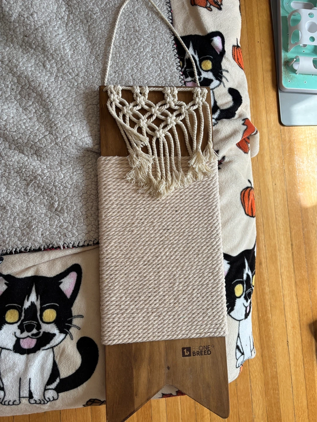 This cat scratching post is wrapped in rope, mounted on a wooden board. It includes a macrame hanging rope. Great quality as any of their products.