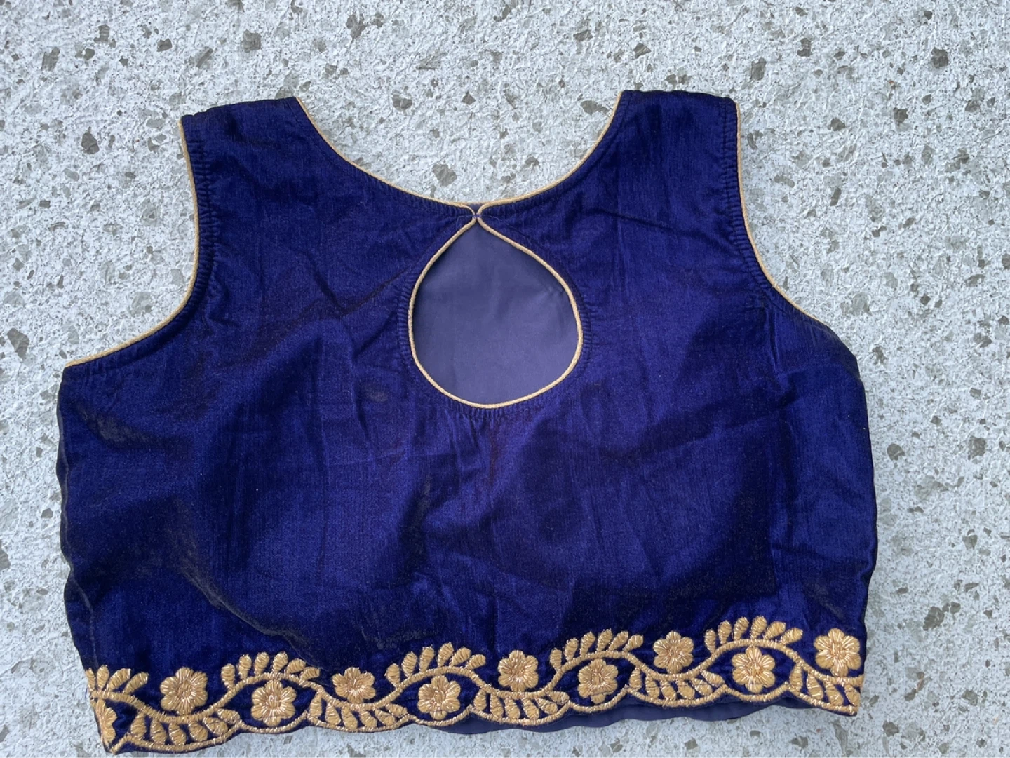 Beautiful navy blue velvet blouse. Features intricate gold embroidery on the neckline and hem. Sleeveless design with a keyhole closure at the back. Perfect for special occasions!