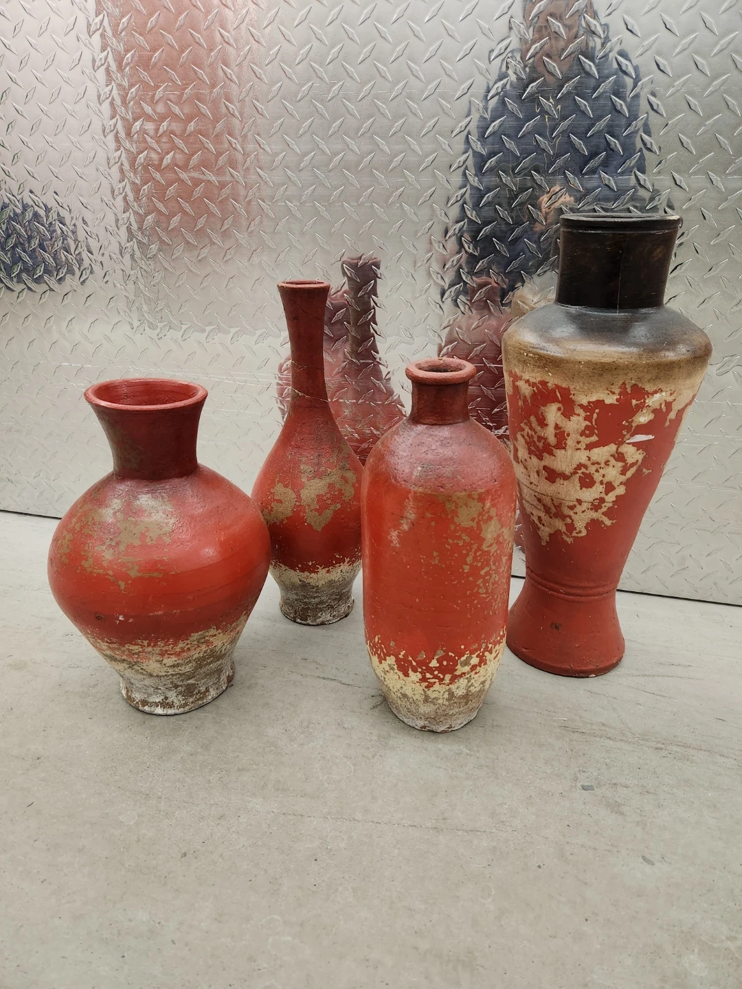 This is a set of four decorative vases. They have a distressed red and khaki finish. These vases are ideal for adding a rustic touch to your home decor.