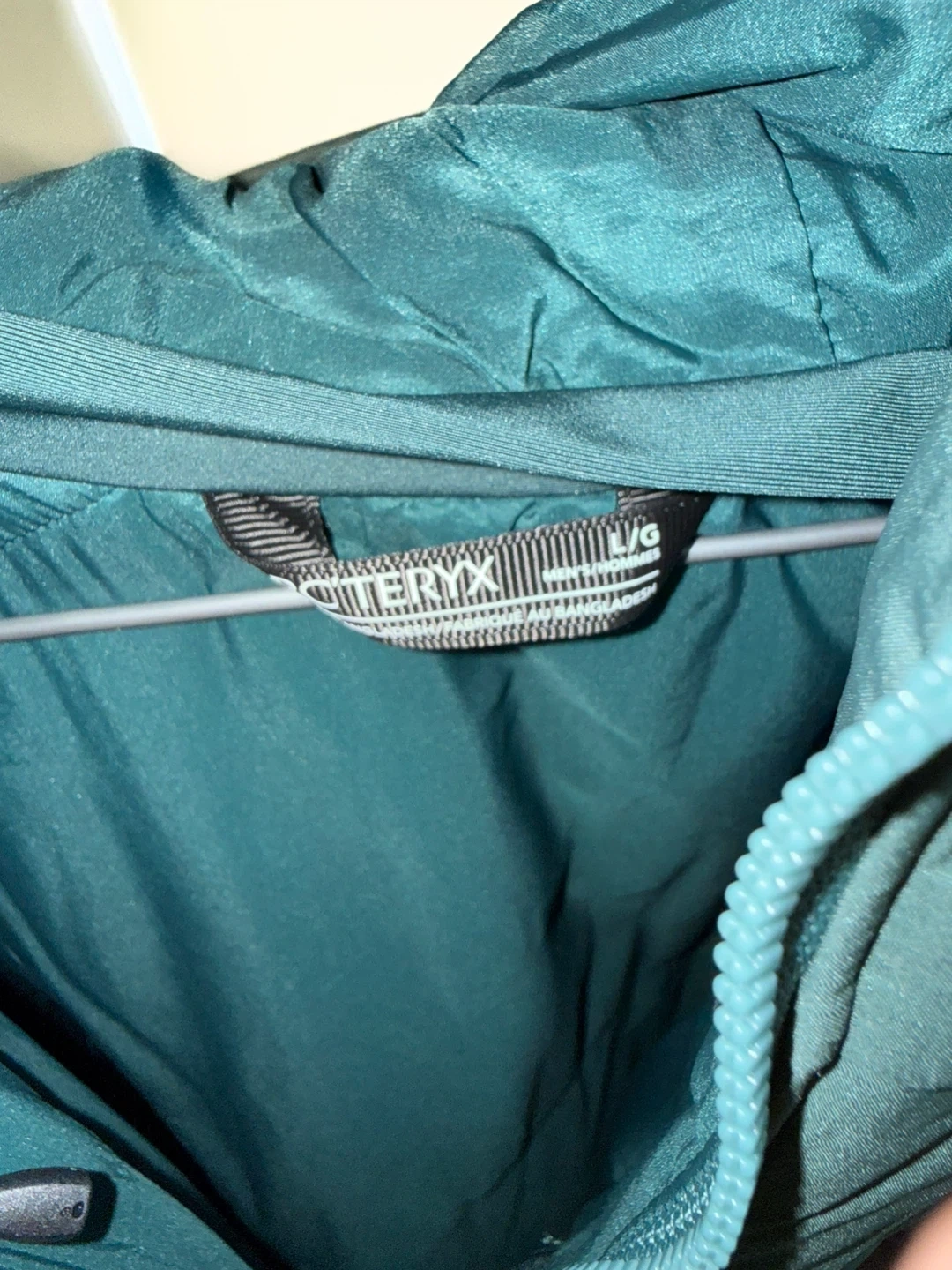 Arc'teryx hooded puffer jacket in a muted green colour. It's a size large. This jacket is lightweight and insulated.