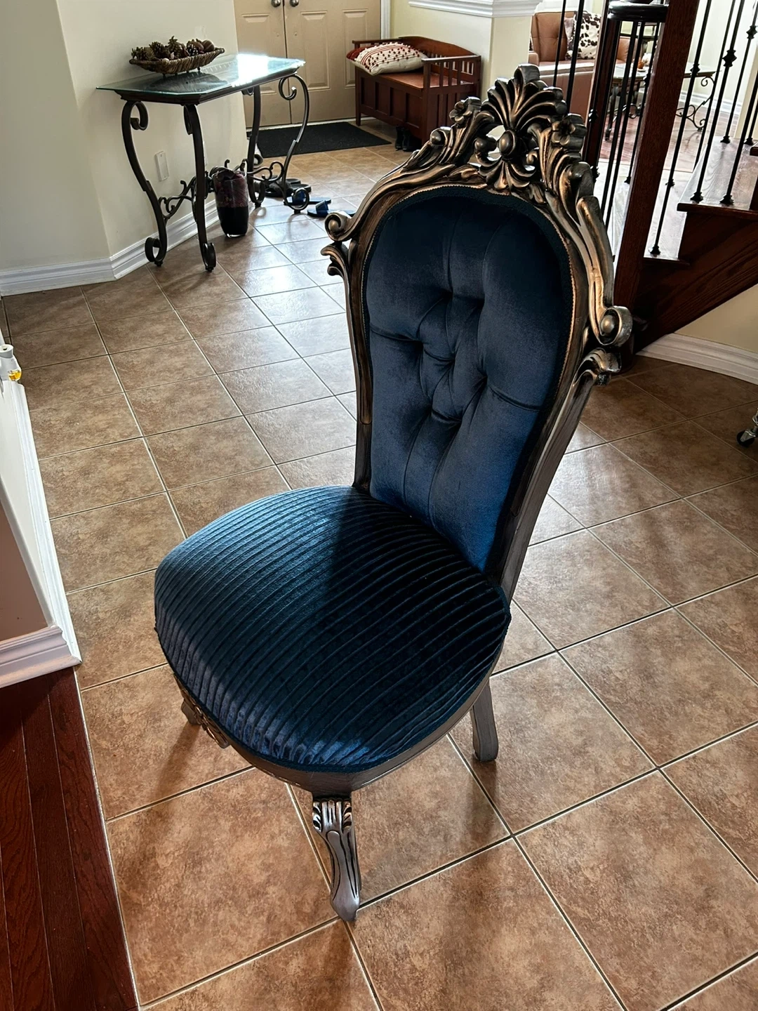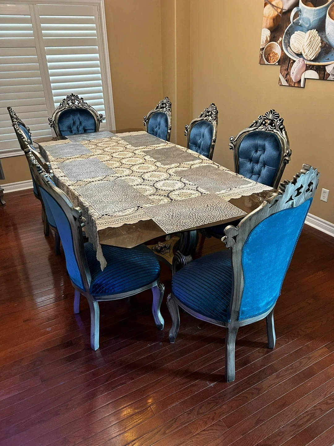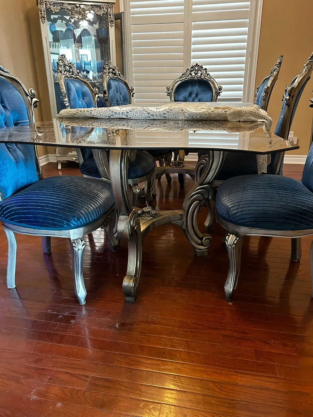 Set of eight ornate dining chairs upholstered in deep blue velvet with silver-toned carved wood accents. These chairs boast a regal, tufted design and would make a statement in any dining room. As well as a full set of living room furniture, display case, same colour drinking glasses also available. Durable construction for long-lasting use.