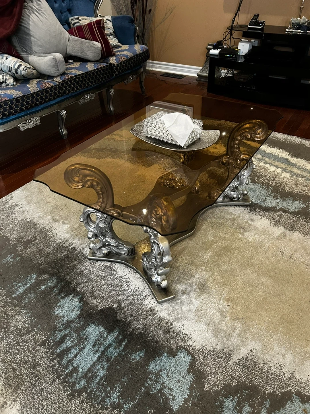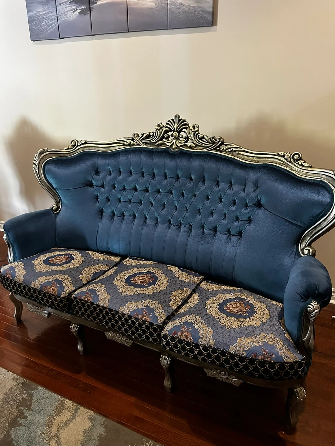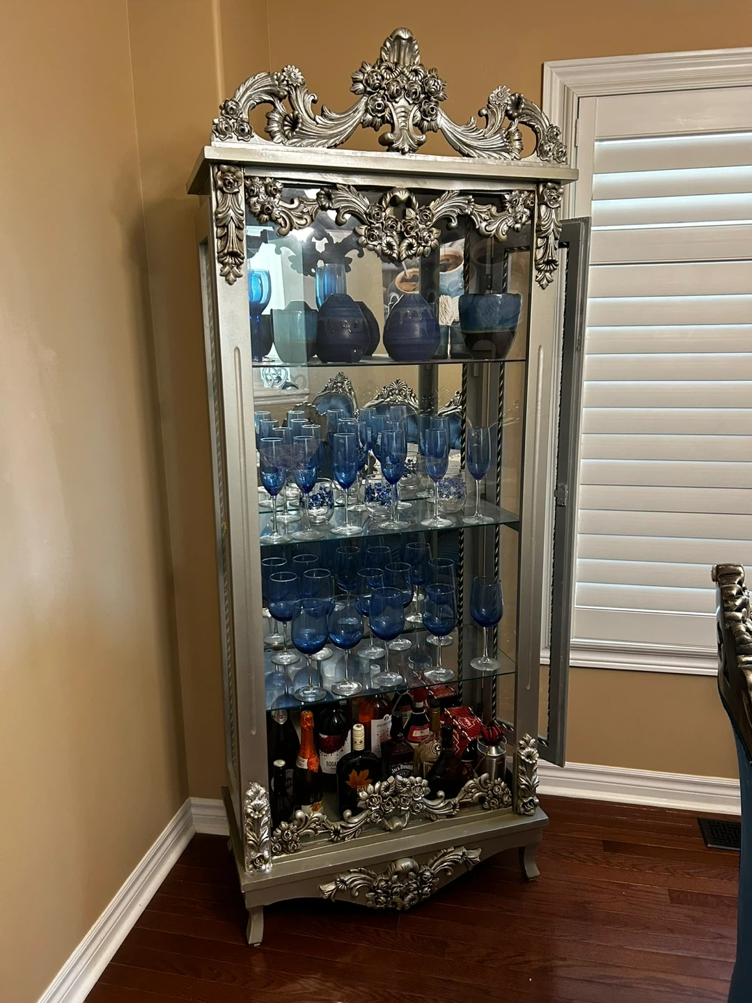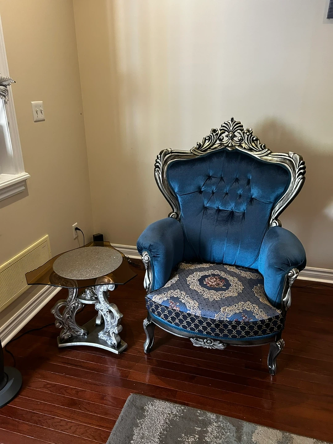 Set of eight ornate dining chairs upholstered in deep blue velvet with silver-toned carved wood accents. These chairs boast a regal, tufted design and would make a statement in any dining room. As well as a full set of living room furniture, display case, same colour drinking glasses also available. Durable construction for long-lasting use.