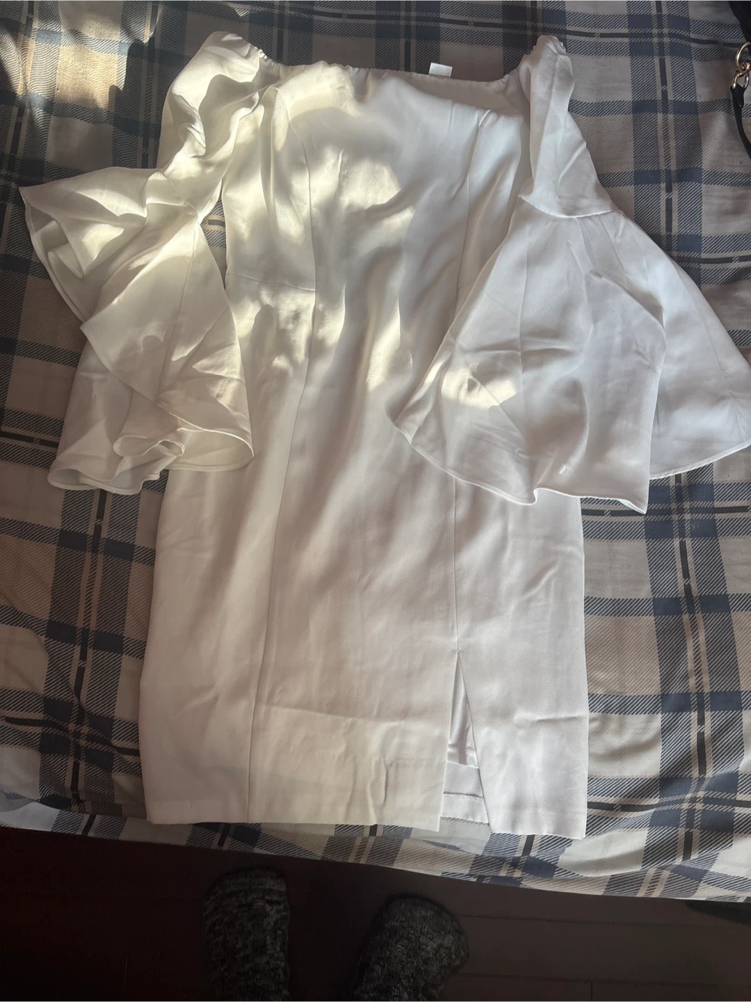 I'm selling these dresses in orange and white. They feature a unique design with ruffles and a slit. Perfect for a party or special occasion!