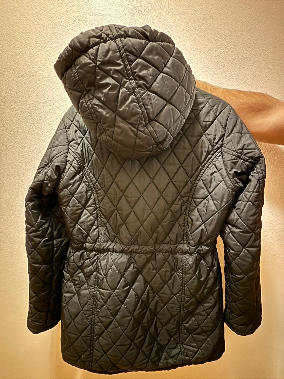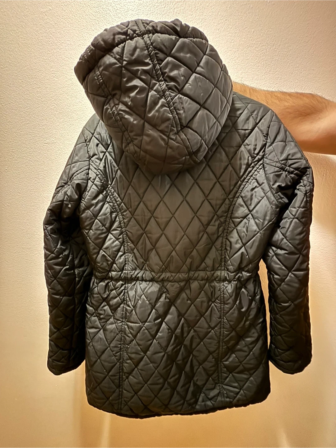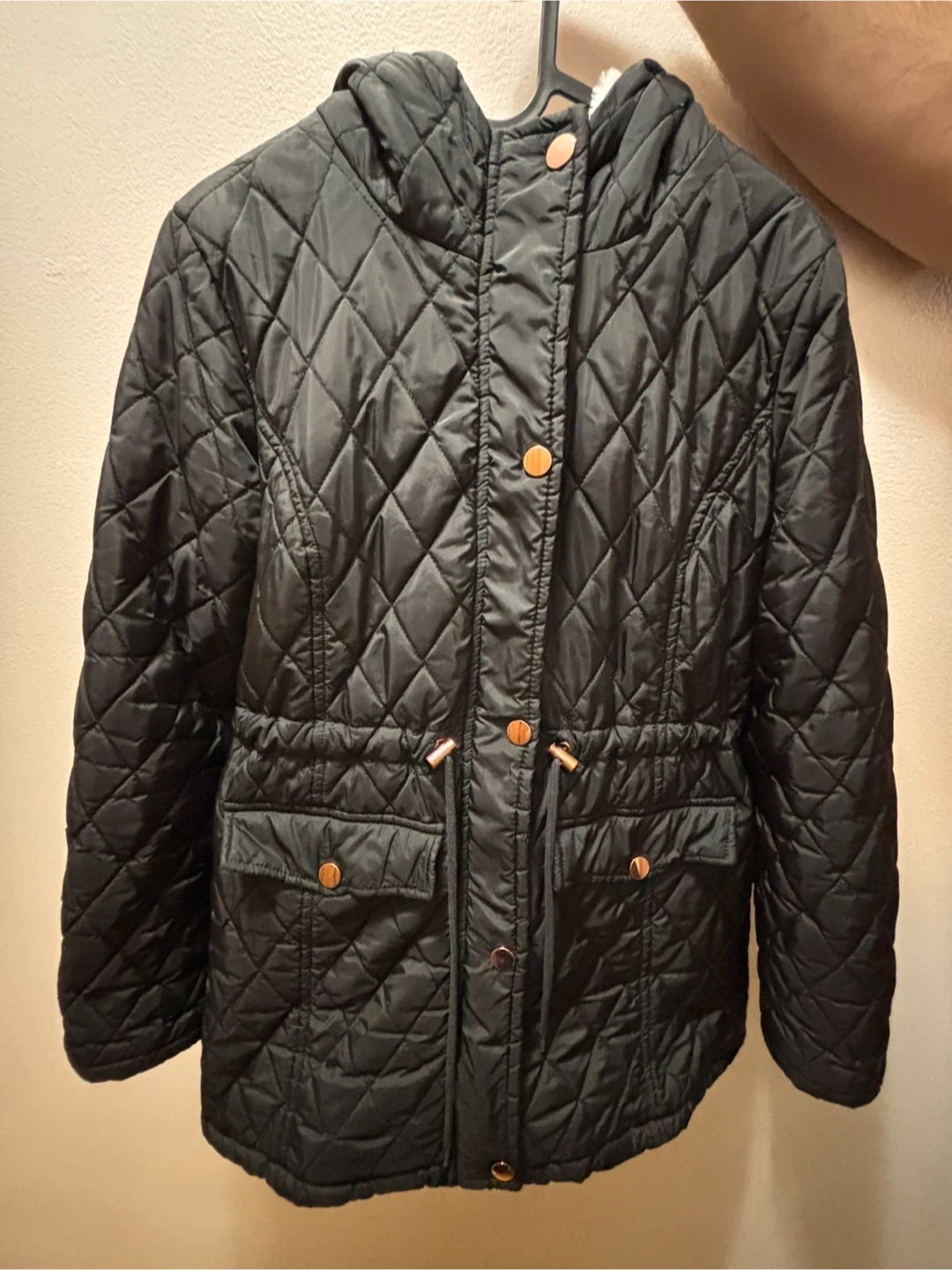 Black quilted hooded jacket with copper-toned hardware. It's cinched at the waist with an adjustable drawstring. This jacket offers a stylish way to stay warm.