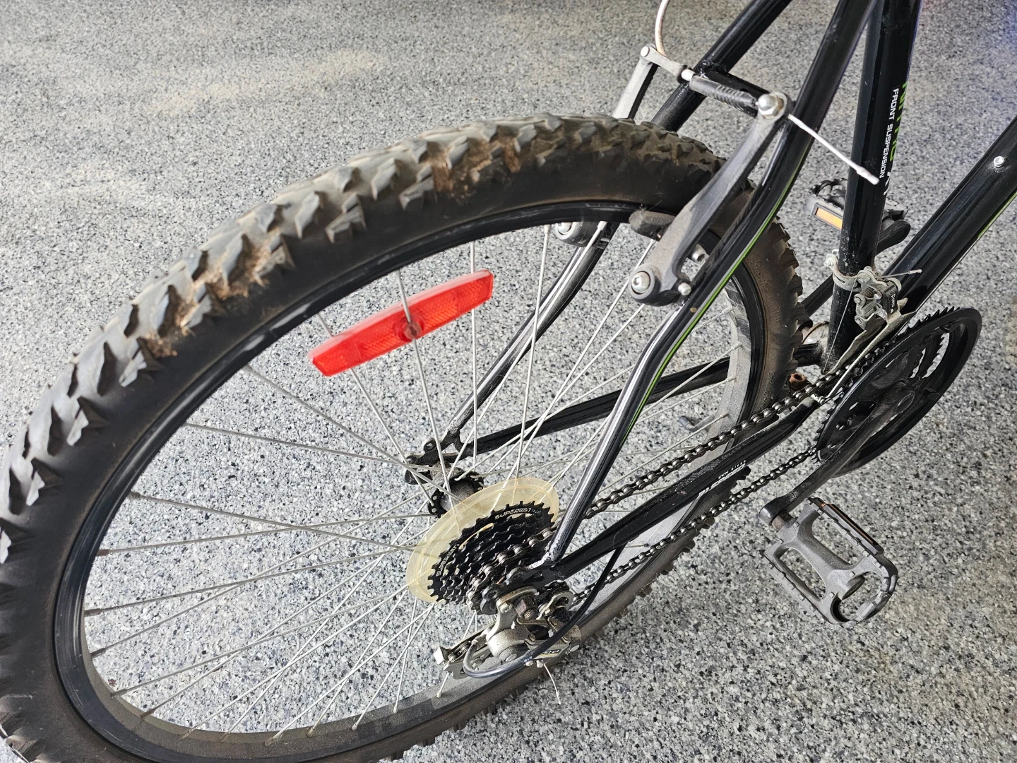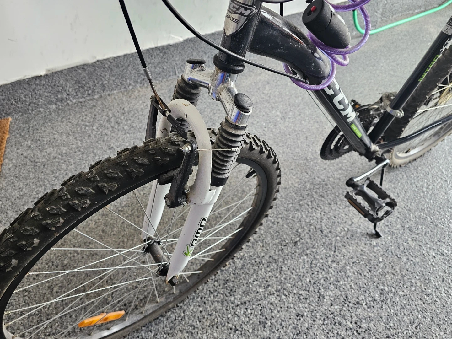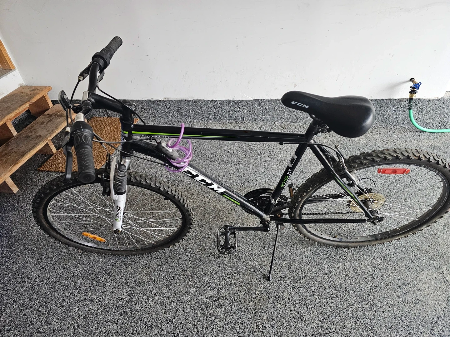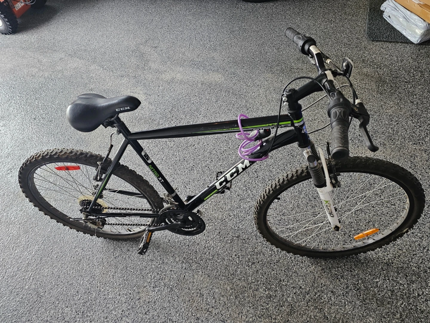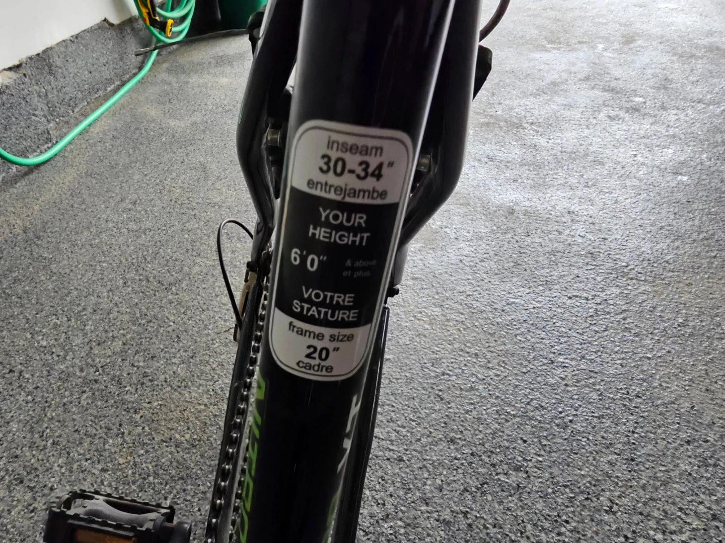 This is a CCM mountain bike with a 20" frame and a 30-34" inseam recommended size. It's black with green accents. Suitable for riders 6'0" and above.