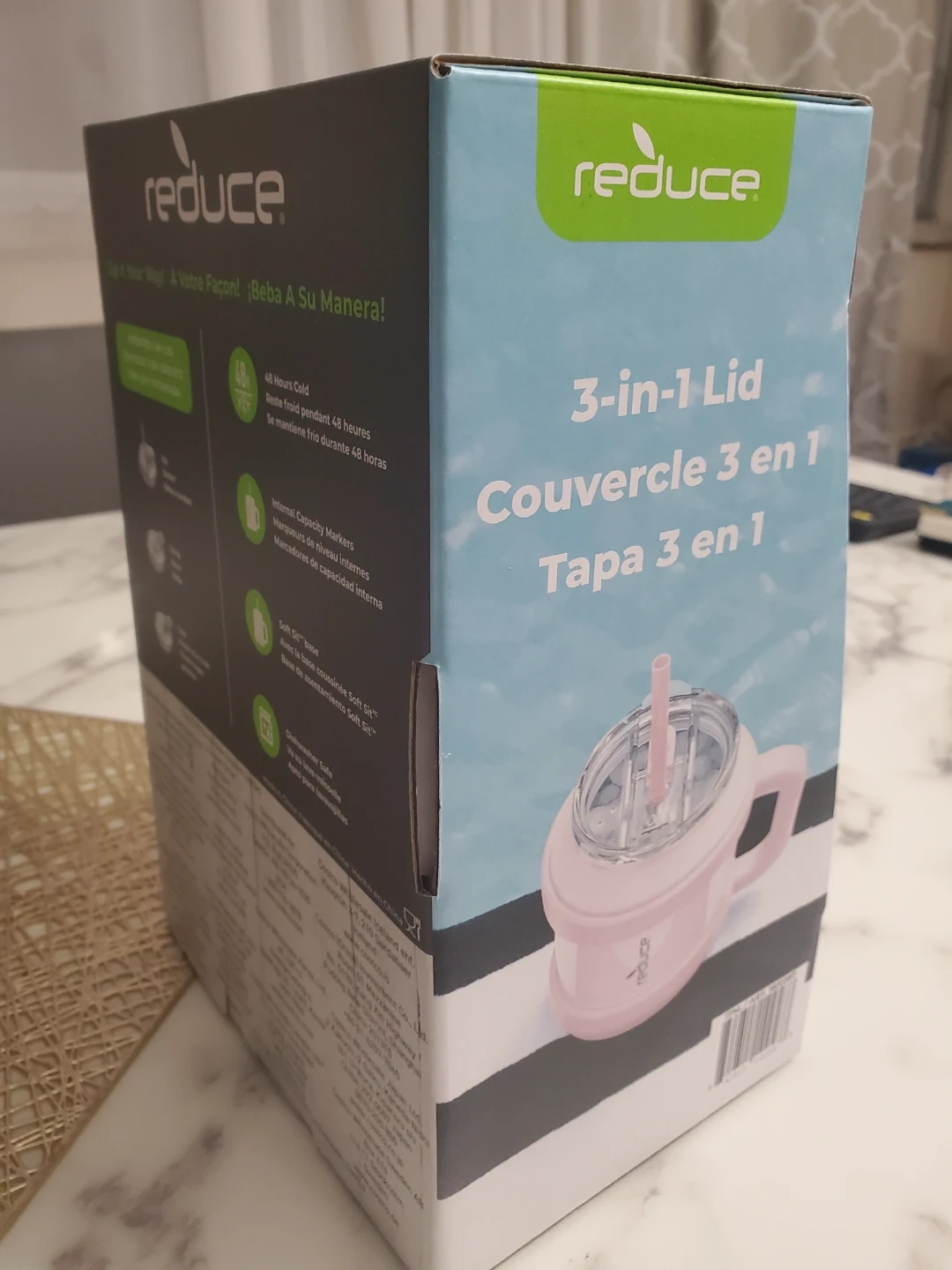 Keep your drinks cold for up to 48 hours with this Reduce Cold1 vacuum insulated mug! It's a 50 oz mug that comes with a 3-in-1 lid and internal capacity markers. The mug is black and comes in its original box