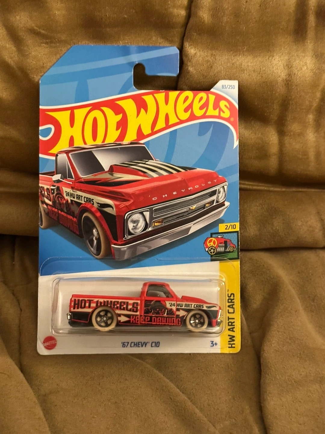 Get your hands on these cool Hot Wheels '67 Chevy C10 die-cast trucks. It's a fun collectible for enthusiasts! Assorted colours available.