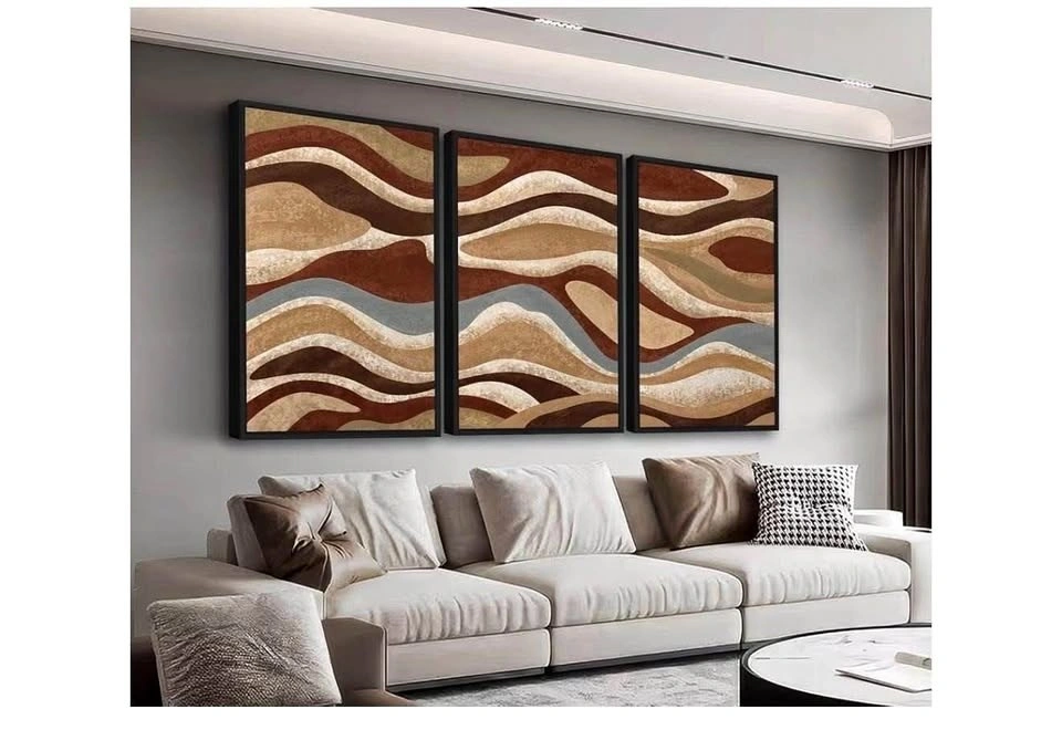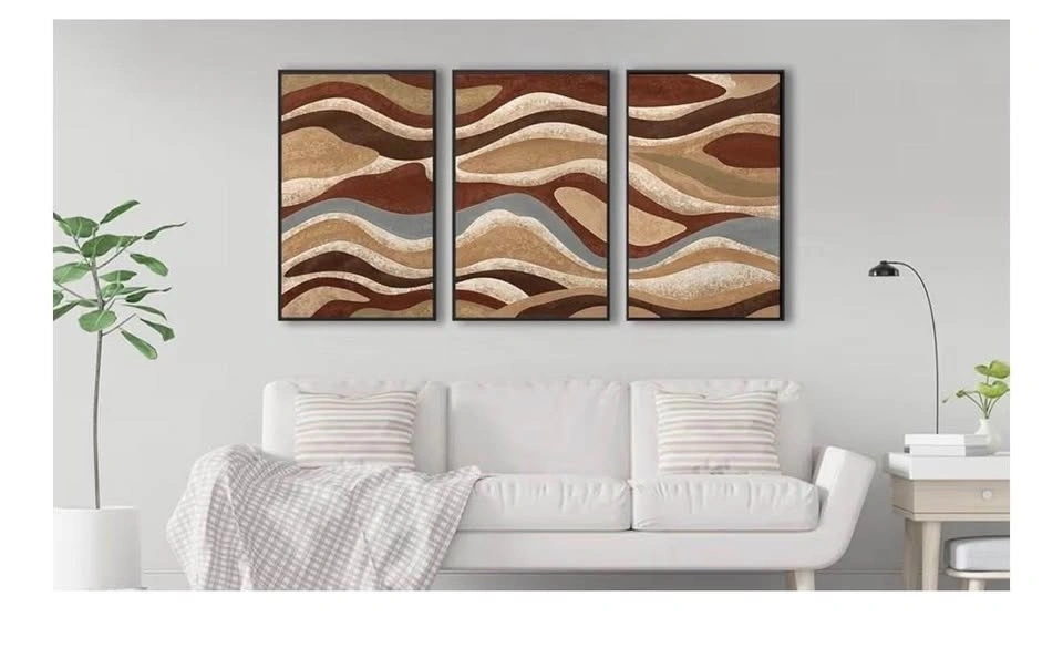 Set of 3 framed abstract art prints featuring brown mountain range designs with modern curved shapes. Rustic retro style canvas pictures, perfect for living room, bedroom, or office. Each piece measures 40cm x 60cm.