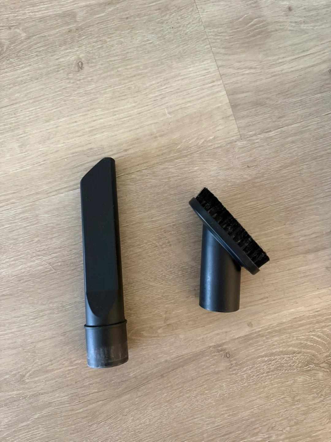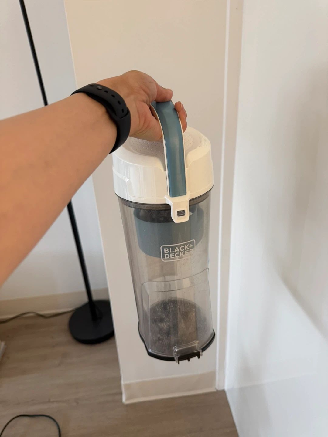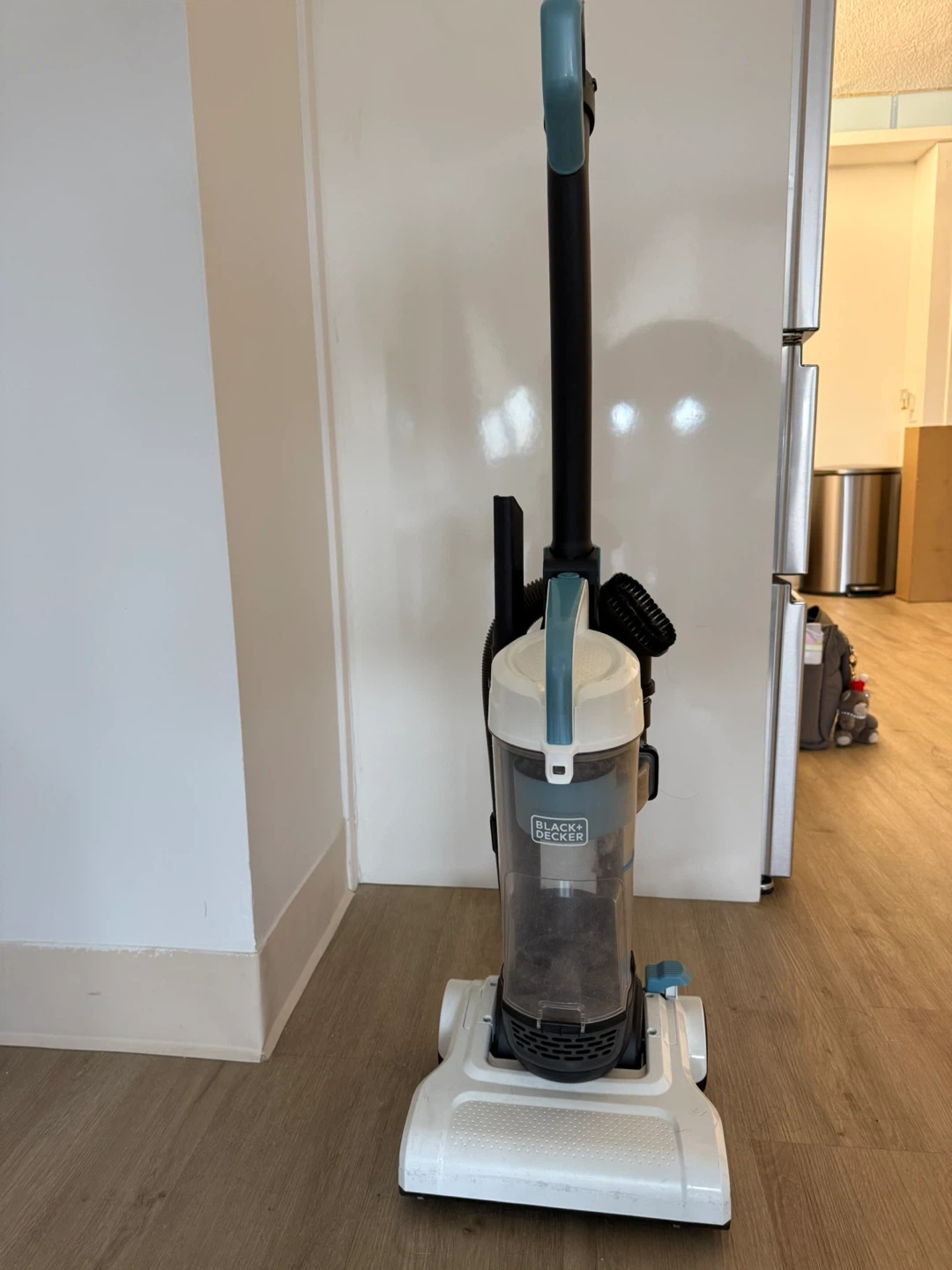 BLACK+DECKER upright vacuum cleaner. Includes crevice tool and brush attachment. Easy to empty dustbin.
