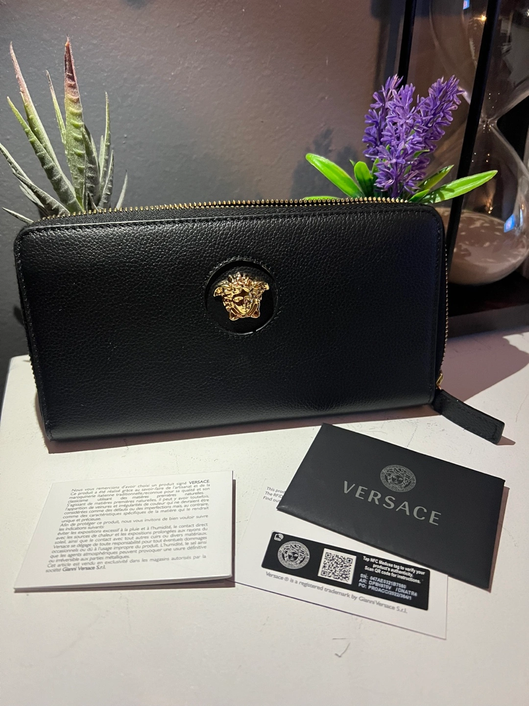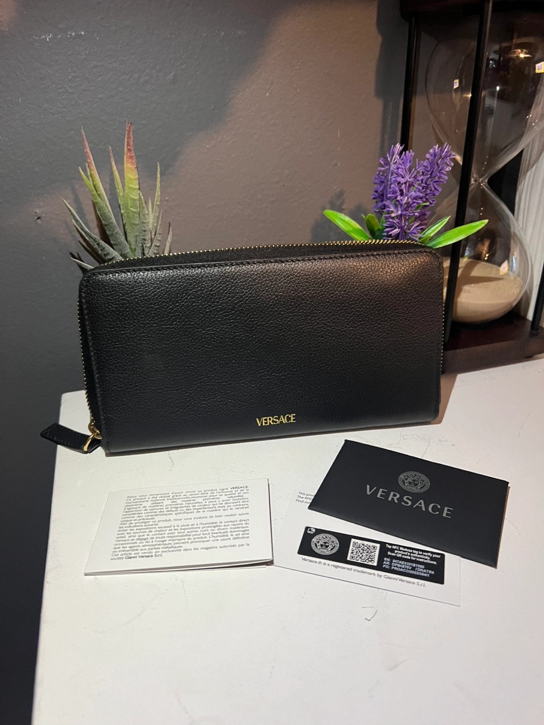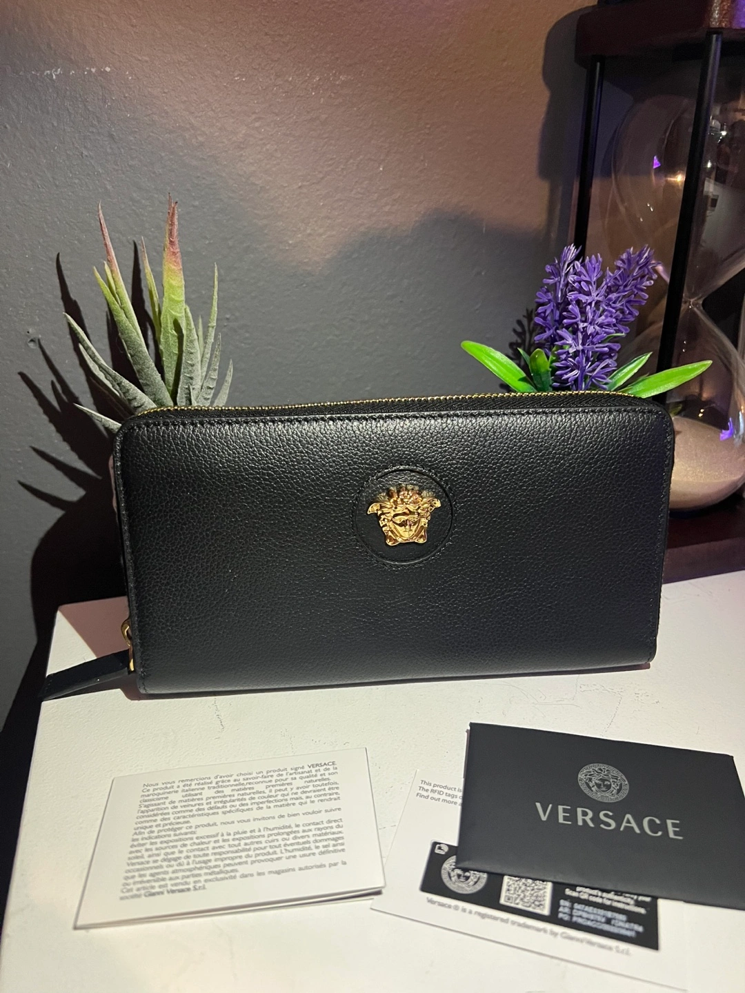 This is a black leather zip-around wallet from Versace. It features the iconic Medusa head emblem. Multiple card slots and compartments inside.