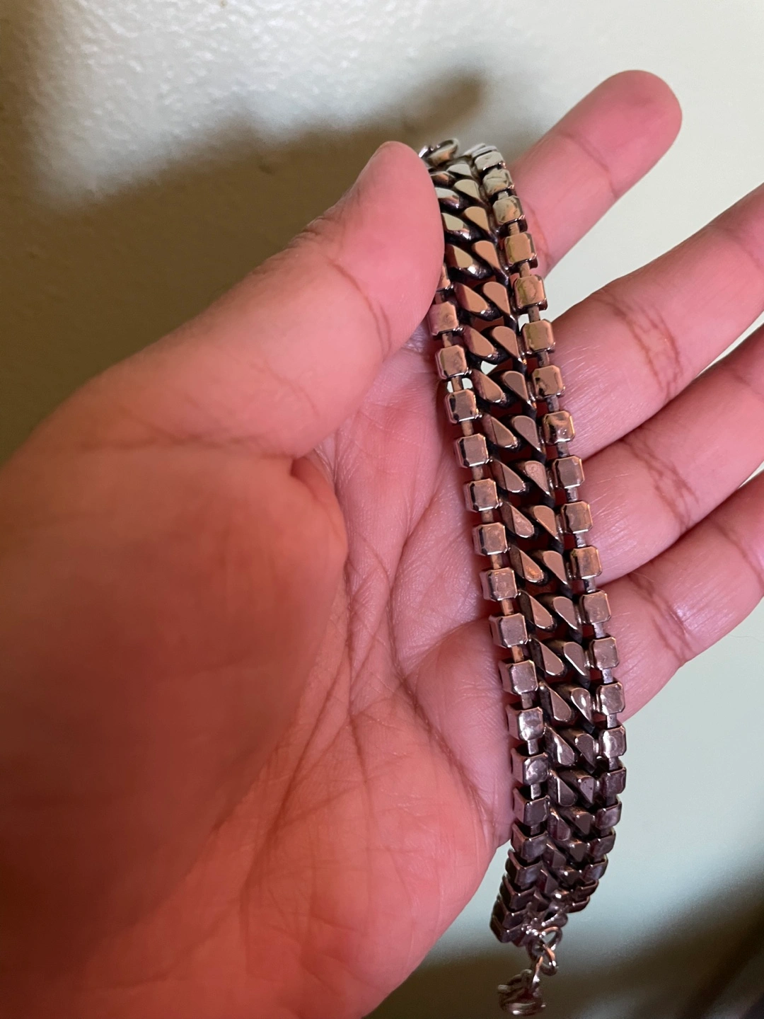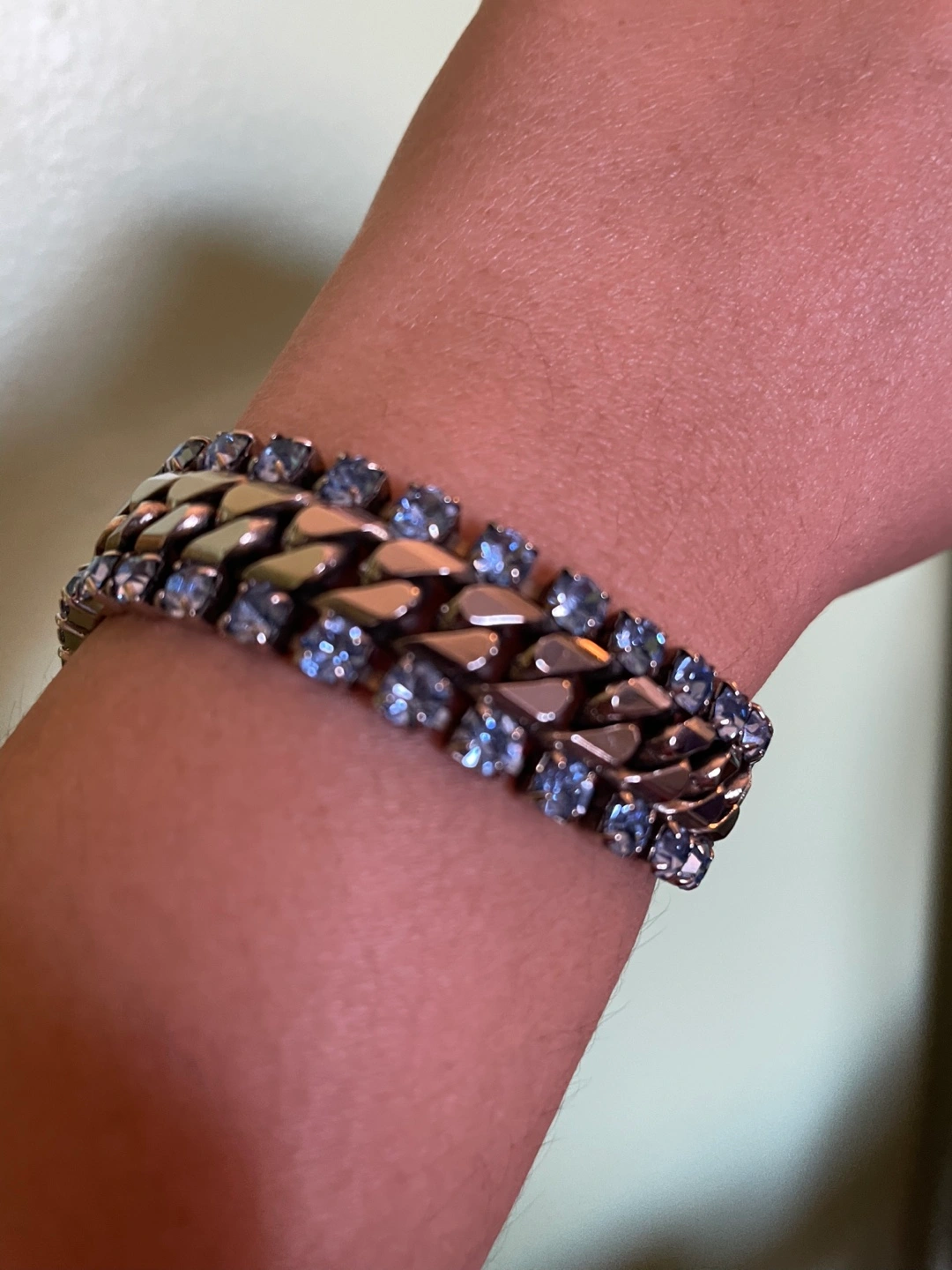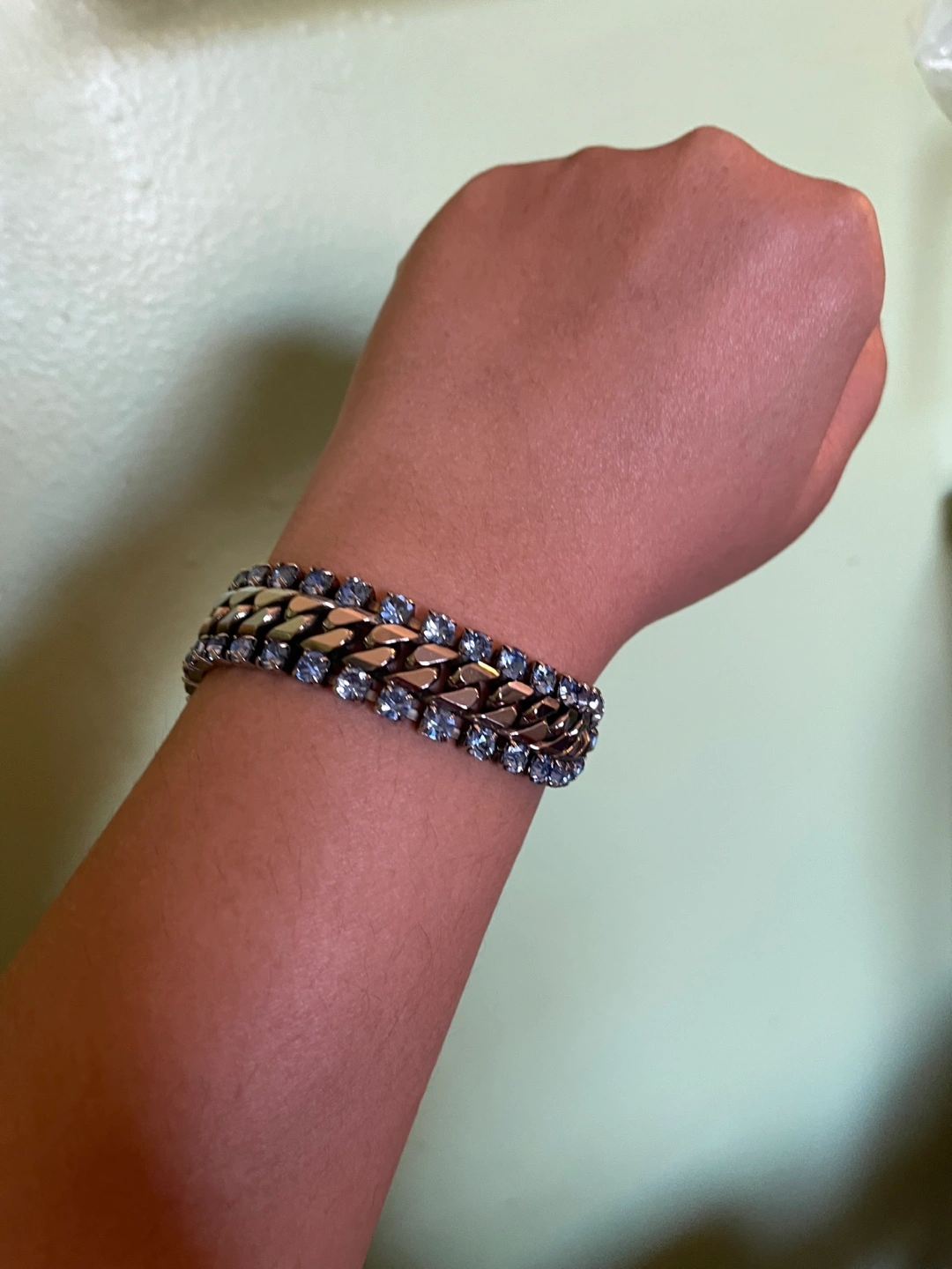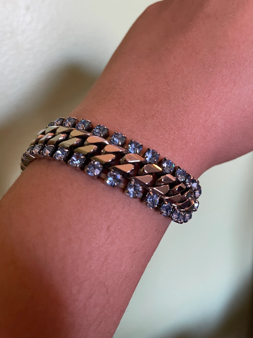 Beautiful bracelet features a double cuban link chain adorned with light blue crystals. Features a small dangling charm. Elegant and eye-catching.